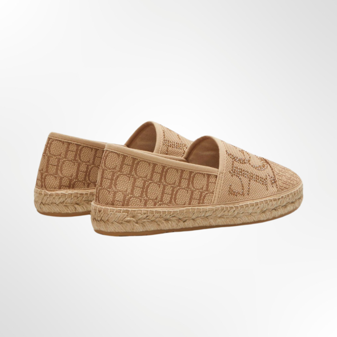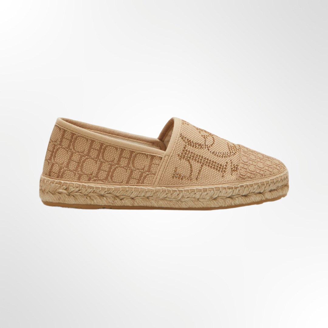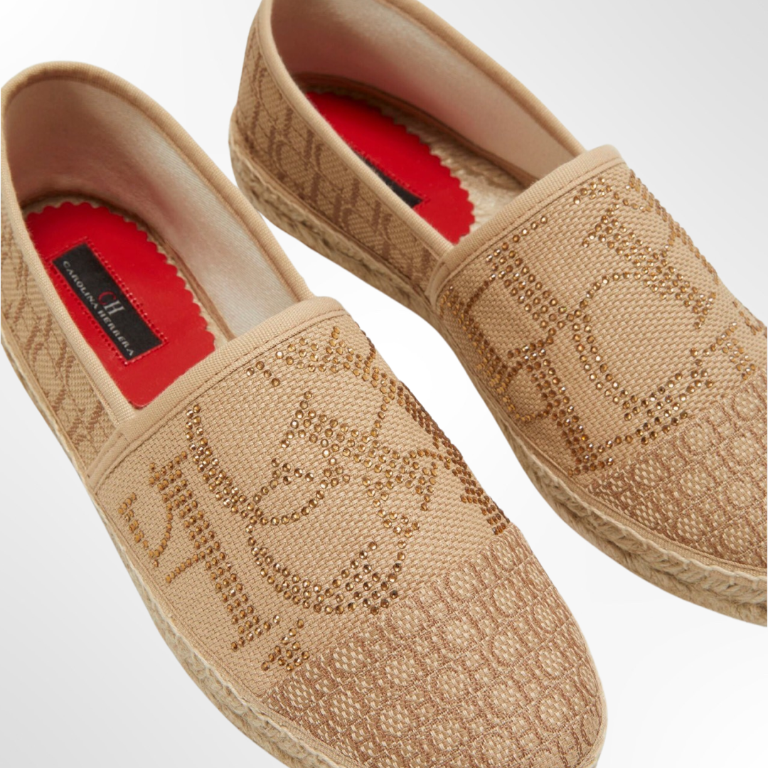 Alpargata en canvas Petra con detalle de abalorios de cristal formando las iniciales de Carolina. Piso de yute. Suela de goma.