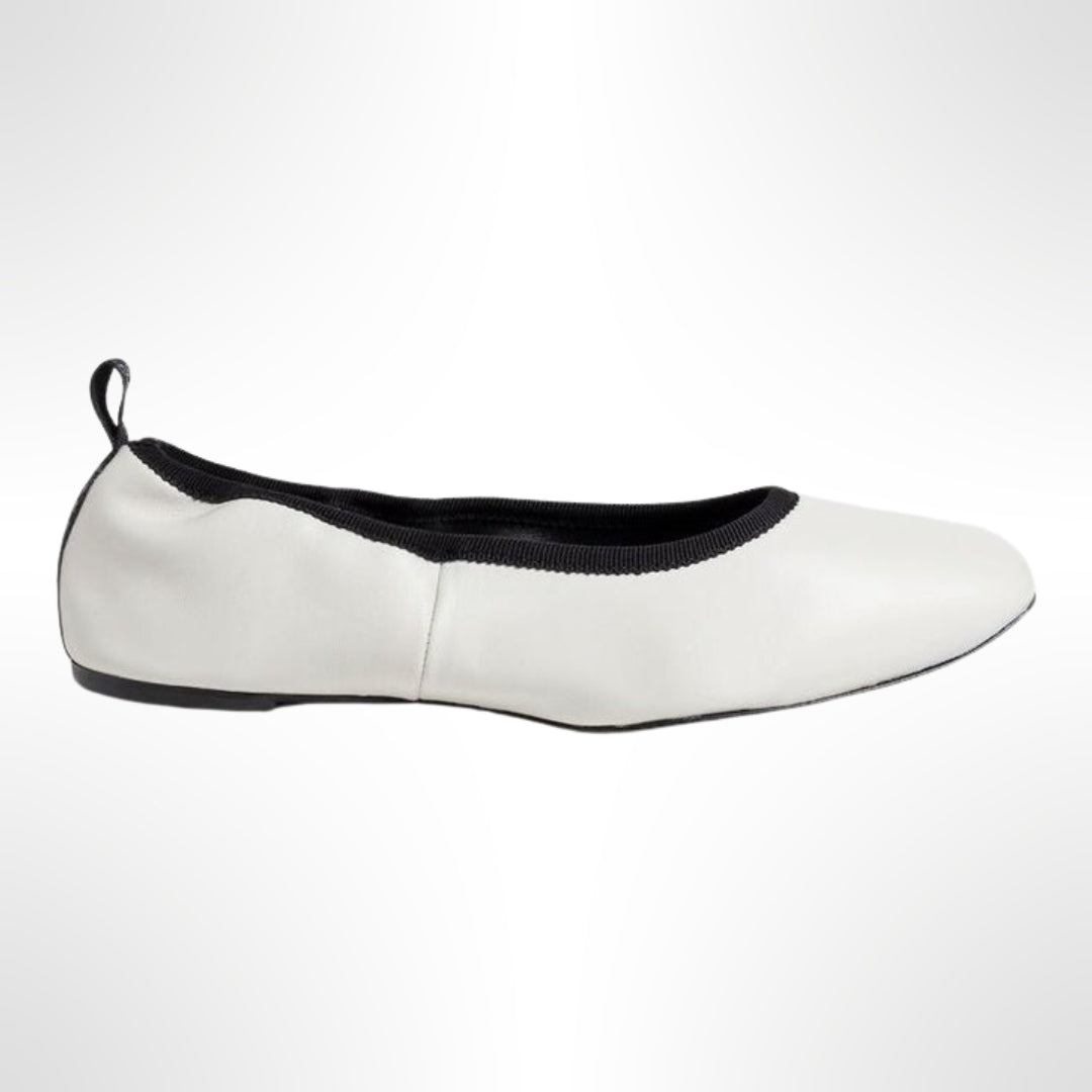 Zapato ballerina elaborado en cuero. Diseño con ribete elástico a contra tono. Punta cuadrada redondeada. Detalle de cinta a contraste con lettering de Castañer en el talón. Suela de cuero lite.
