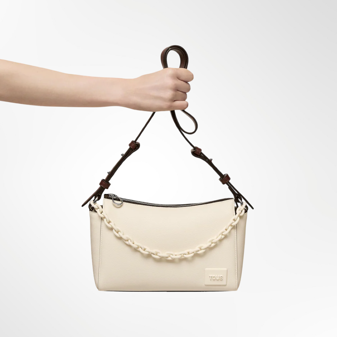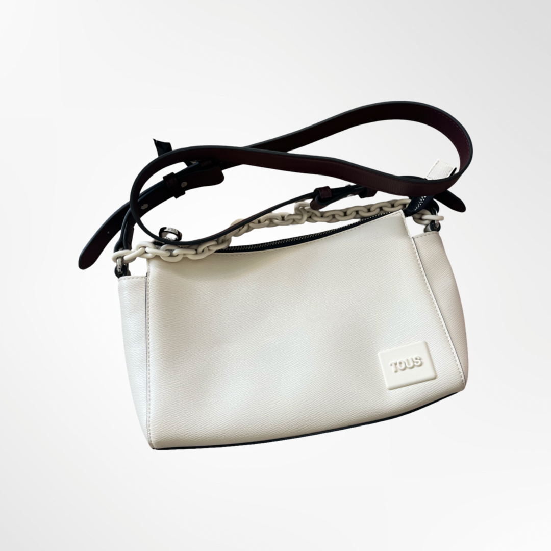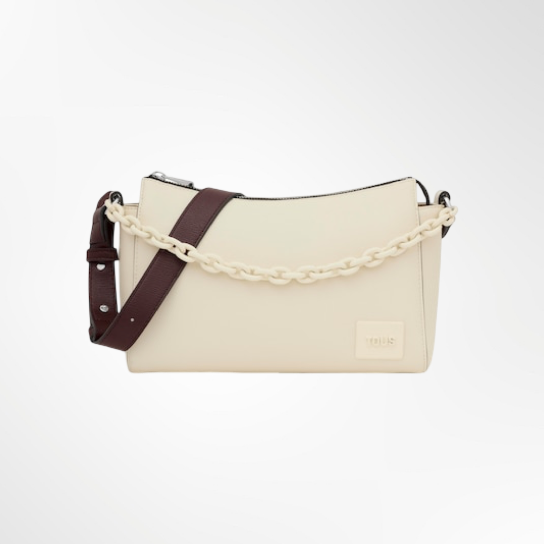 Bolso bandolera mediano TOUS Amanda de piel sintética en color negro y beige. Cierre de cremallera. Bolsillo interior abierto. Asa fija de hombro y asa bandolera ajustable.