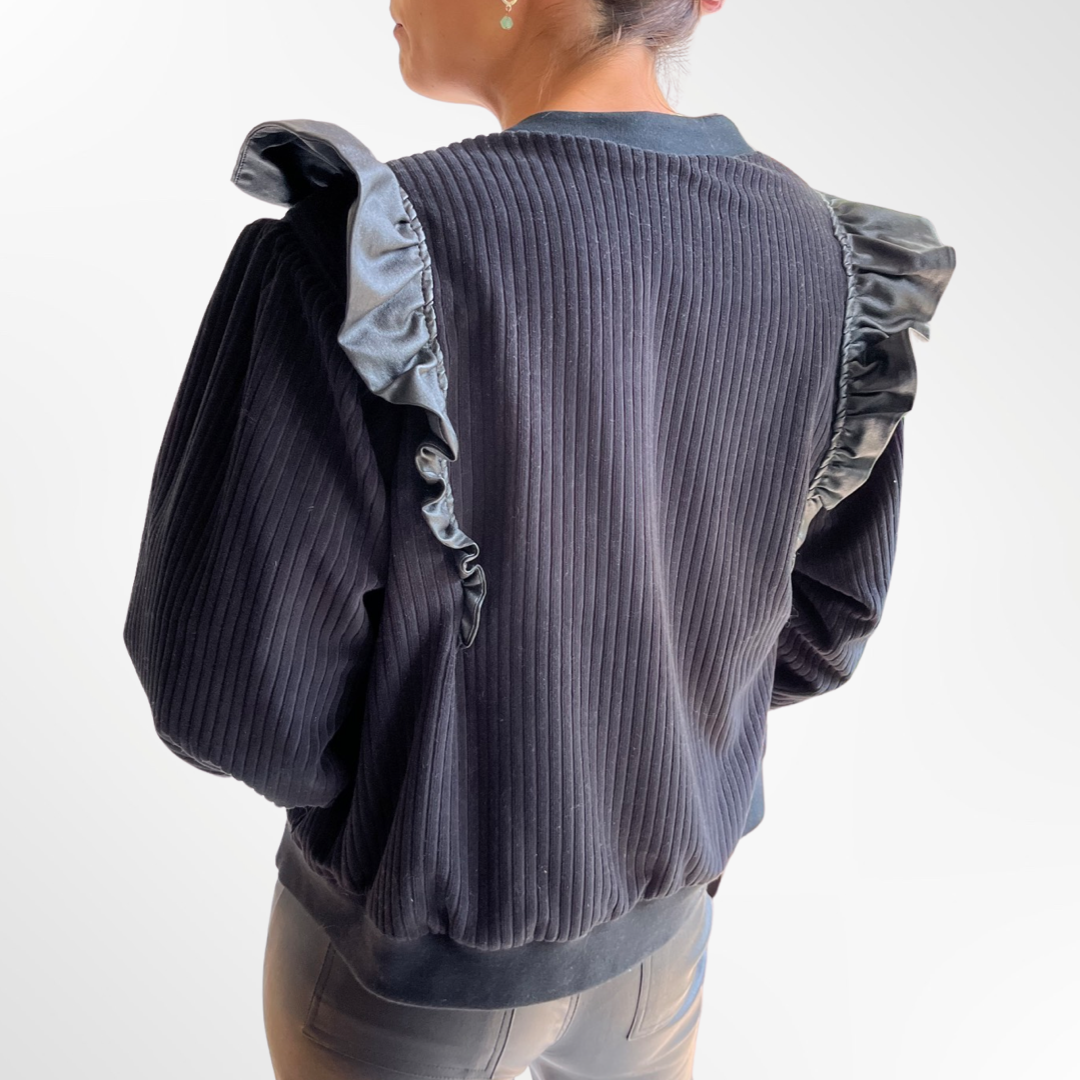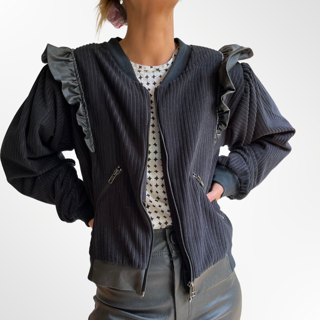Bomber fabricada en cotejé suave de excelente caída y detalle de volados coated similares cuero en hombros que caen de manera vertical tanto en espalda como en la parte delantera. Cierre delantero y bolsillos laterales con cierre.