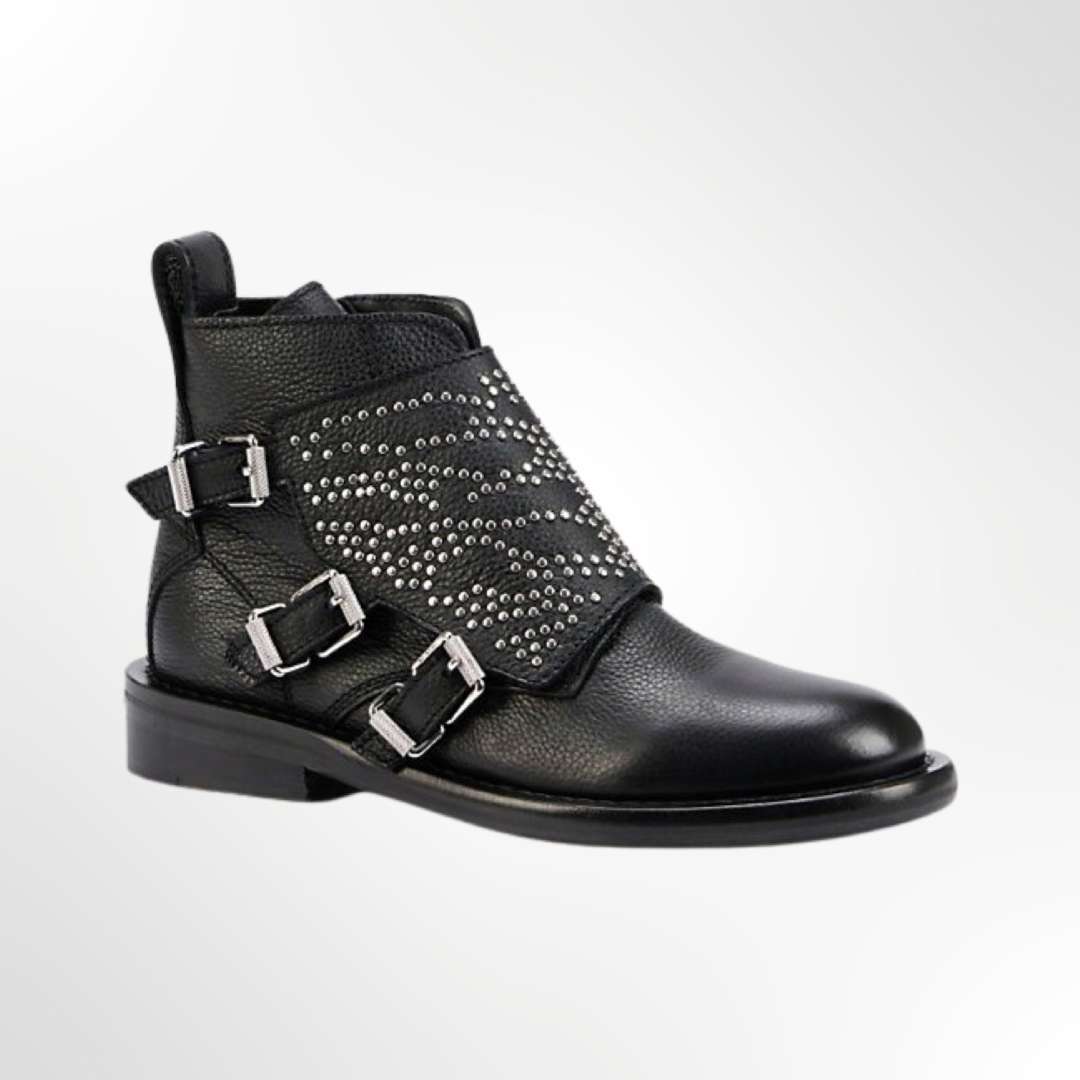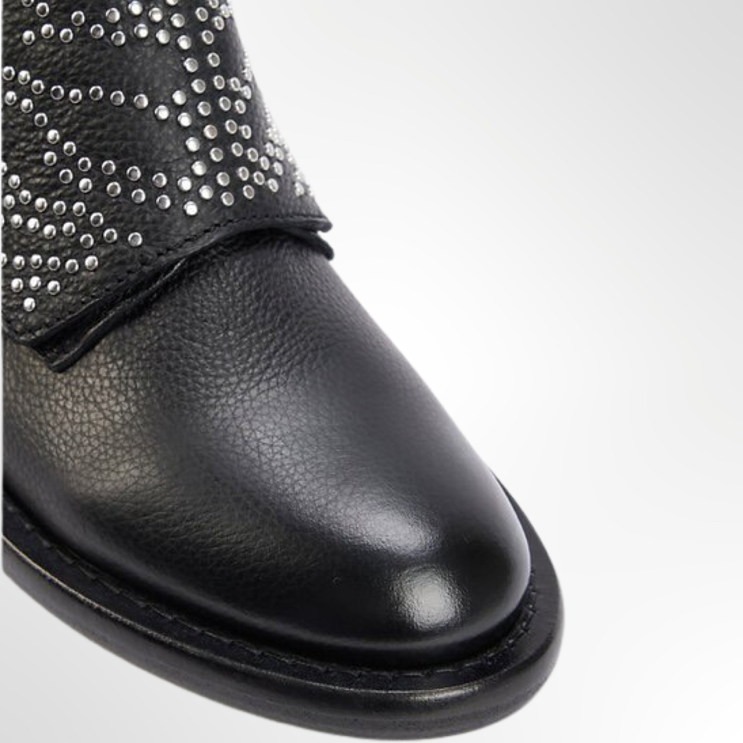 Bota de cuero negra con apliques en tono plateado, lengüeta en la parte posterior, cierre lateral con hebilla, puntera redonda, plantilla con logo y suela plana.
