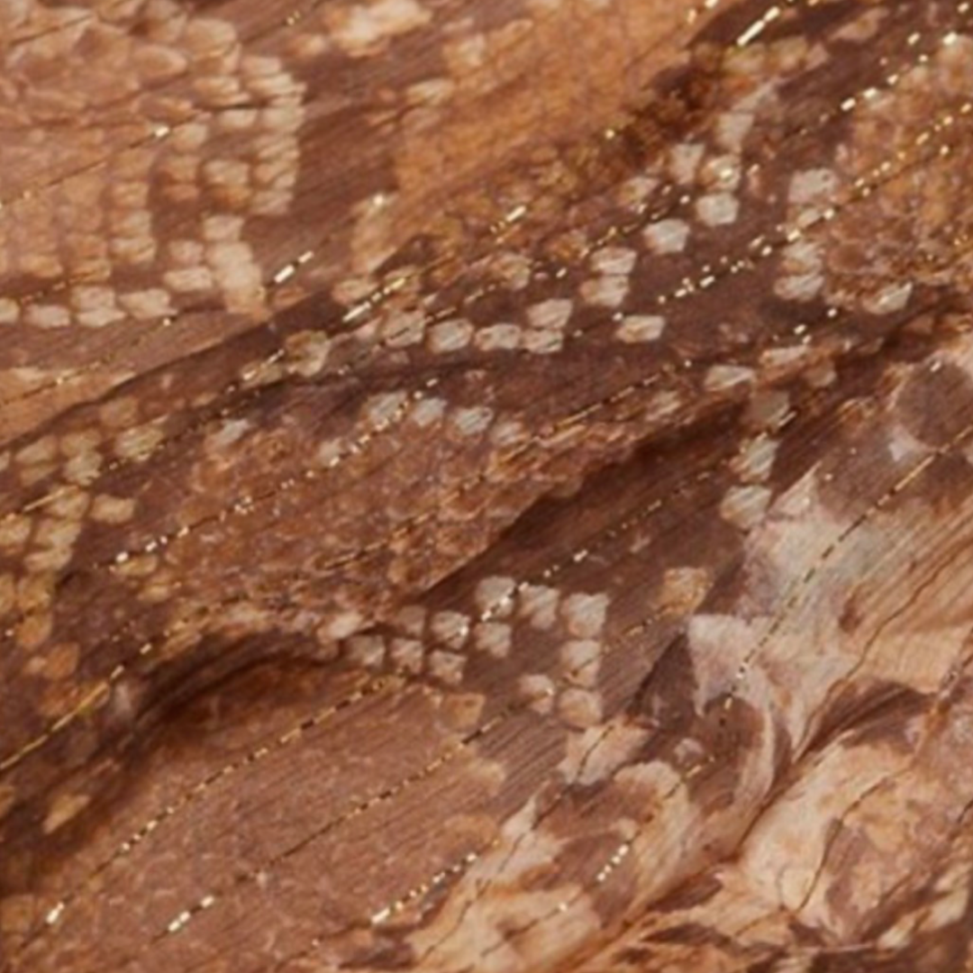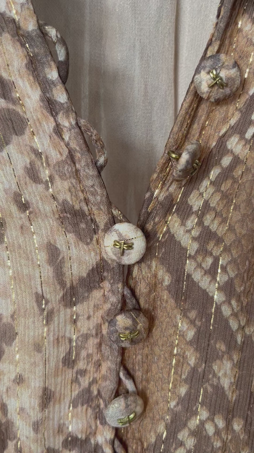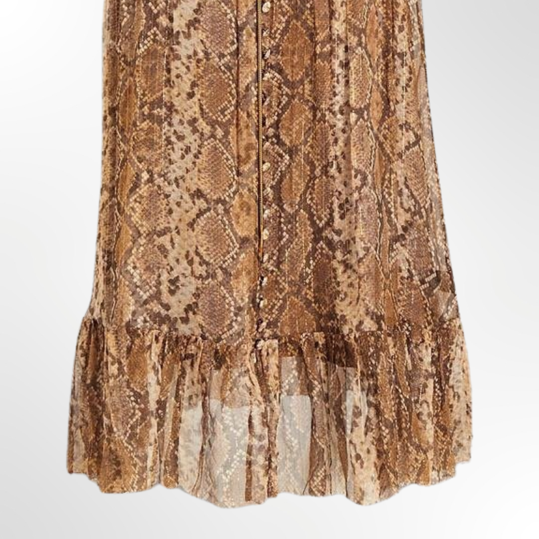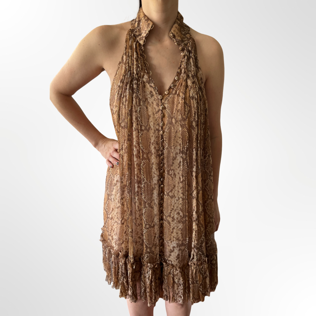 Mini vestido con estampado animal print. Sin margas y cuello escote en V. Tiene hilos dorados en su estampado.