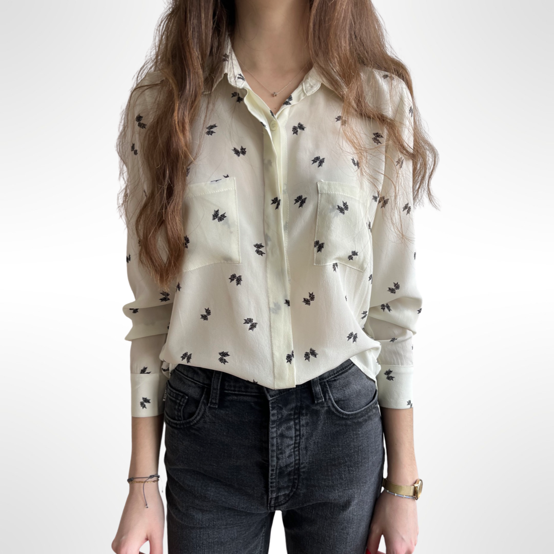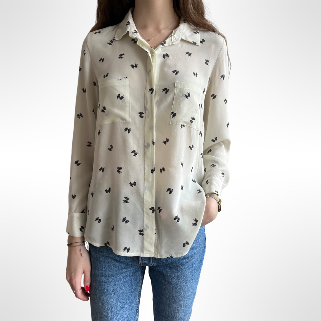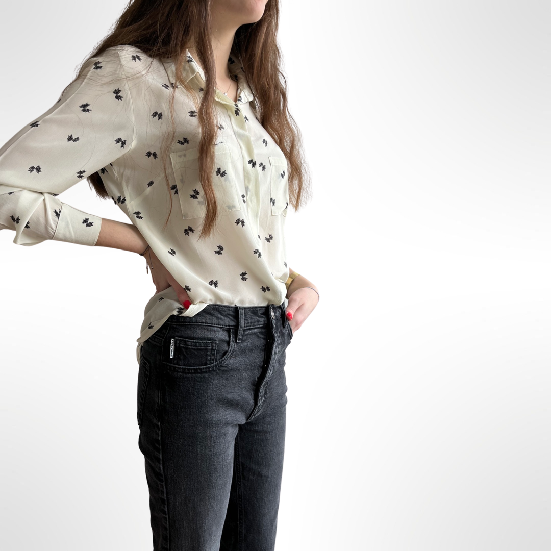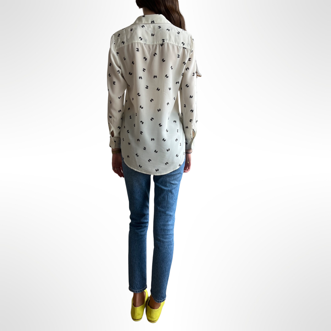Camisa blanca diseño pequeños lazos negros, abotonada por delante.