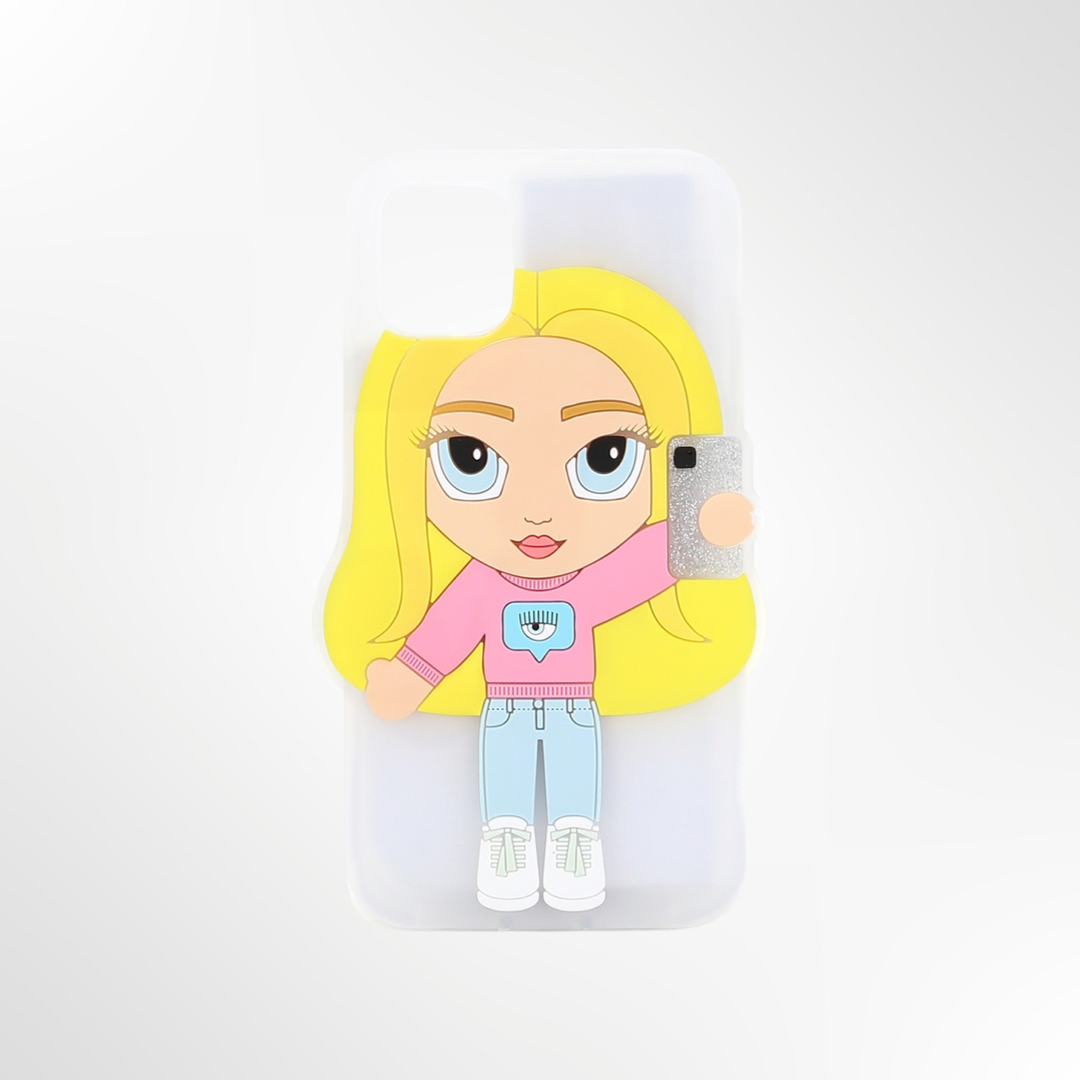 Carcaza transparente para iphone 12 con logo muñeca de la marca.
