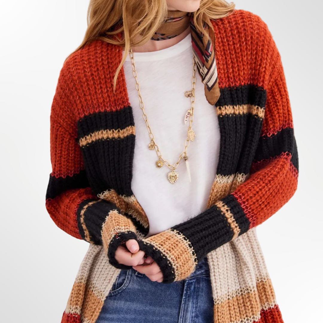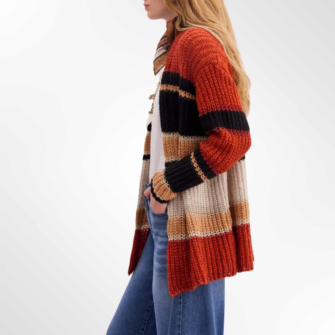 Tapado tejido con detalles en hilo de lurex, que combina rayas de distintos colores y anchos. Largo arriba de las rodillas, su calce es amplio y relajado, y cuenta con la badana de marca en la espalda característica de nuestros tejidos.