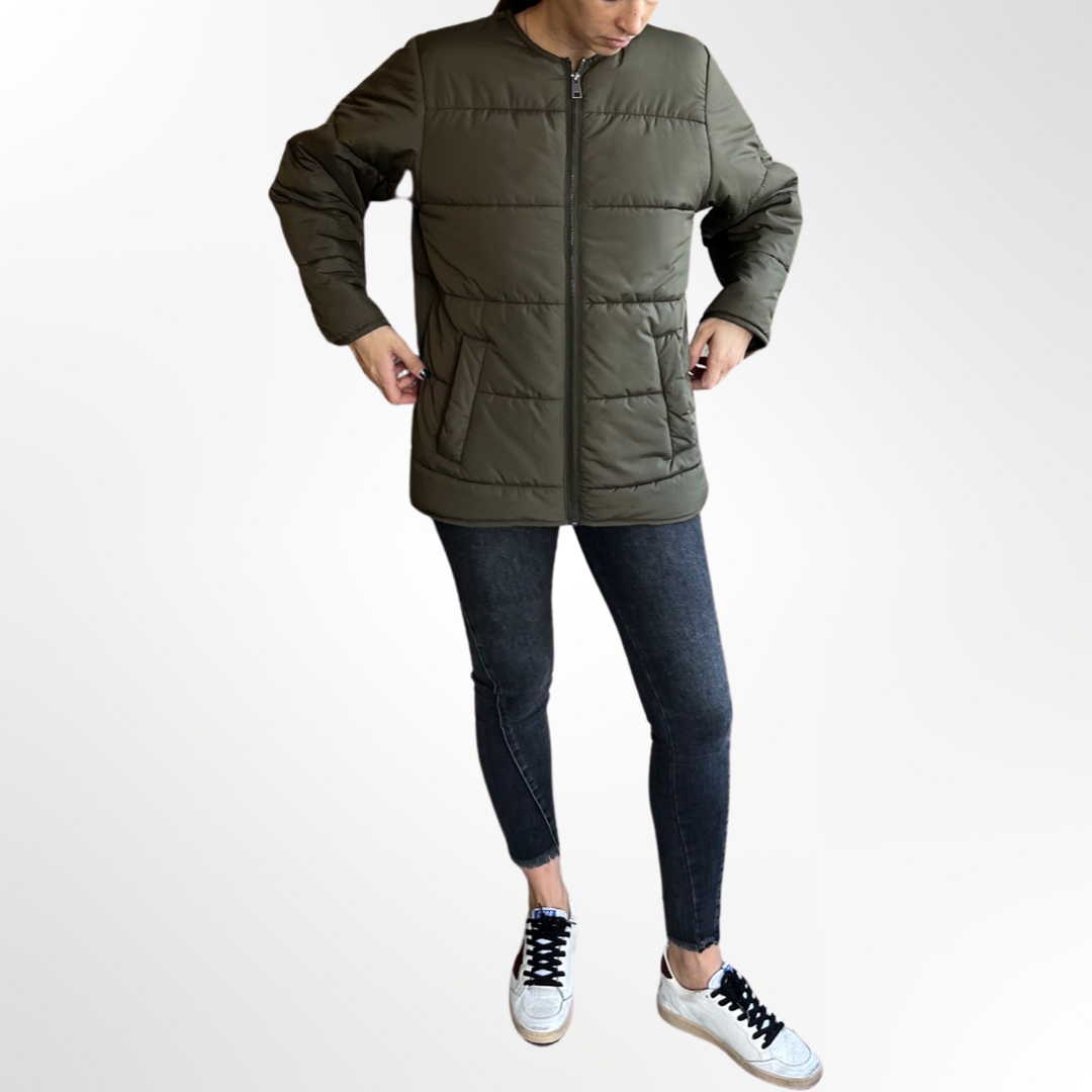 Parka color kaki acolchado con cierre de cremallera, dos bolsillos abiertos y manga larga.