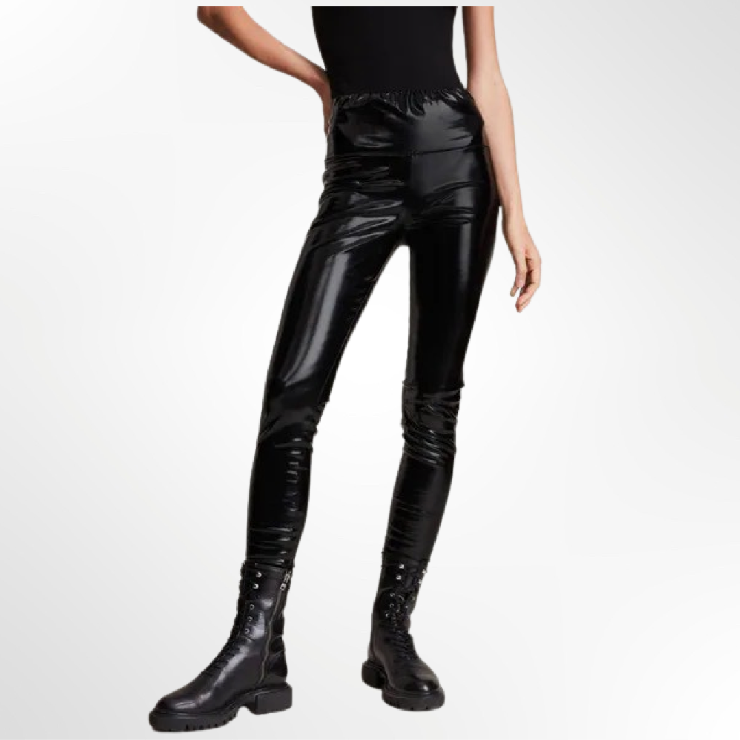 Leggings ajustados en color negro brillante. Cintura elasticada (no tiene cierre)
