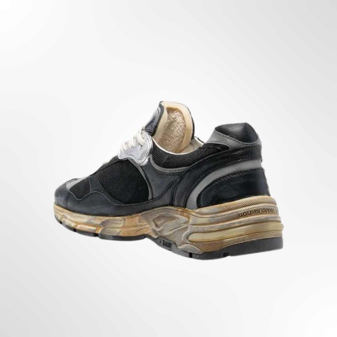Zapatillas tratamiento vintage negra, en piel de becerro. Parche de estrellas, logo estampado en el lateral y cierre con cordones.