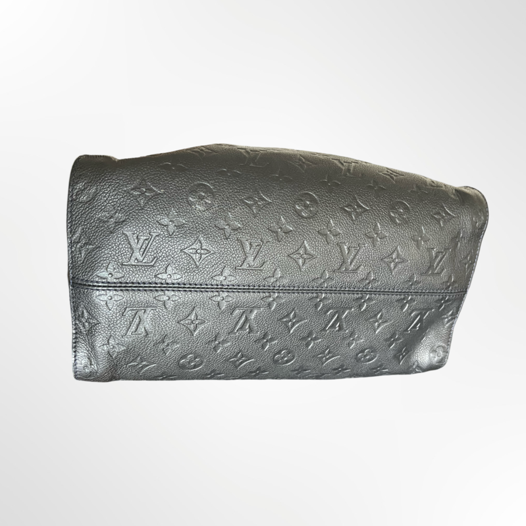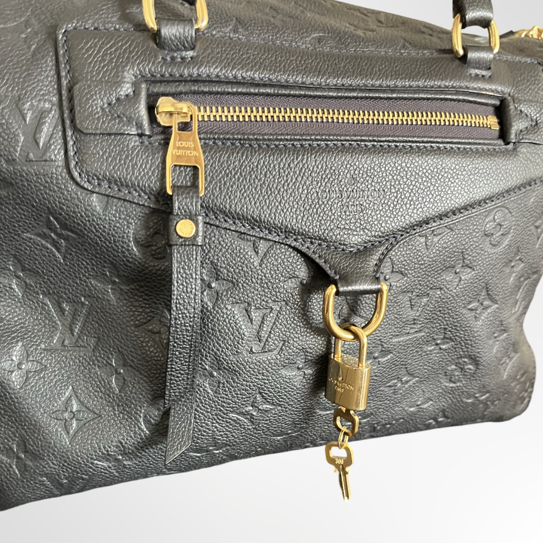 Bolso de cuero azul marino con el clásico patrón canvas de la marca en relieve. Viene con strap removible con herrajes en tonos Dorados y candado con llave.