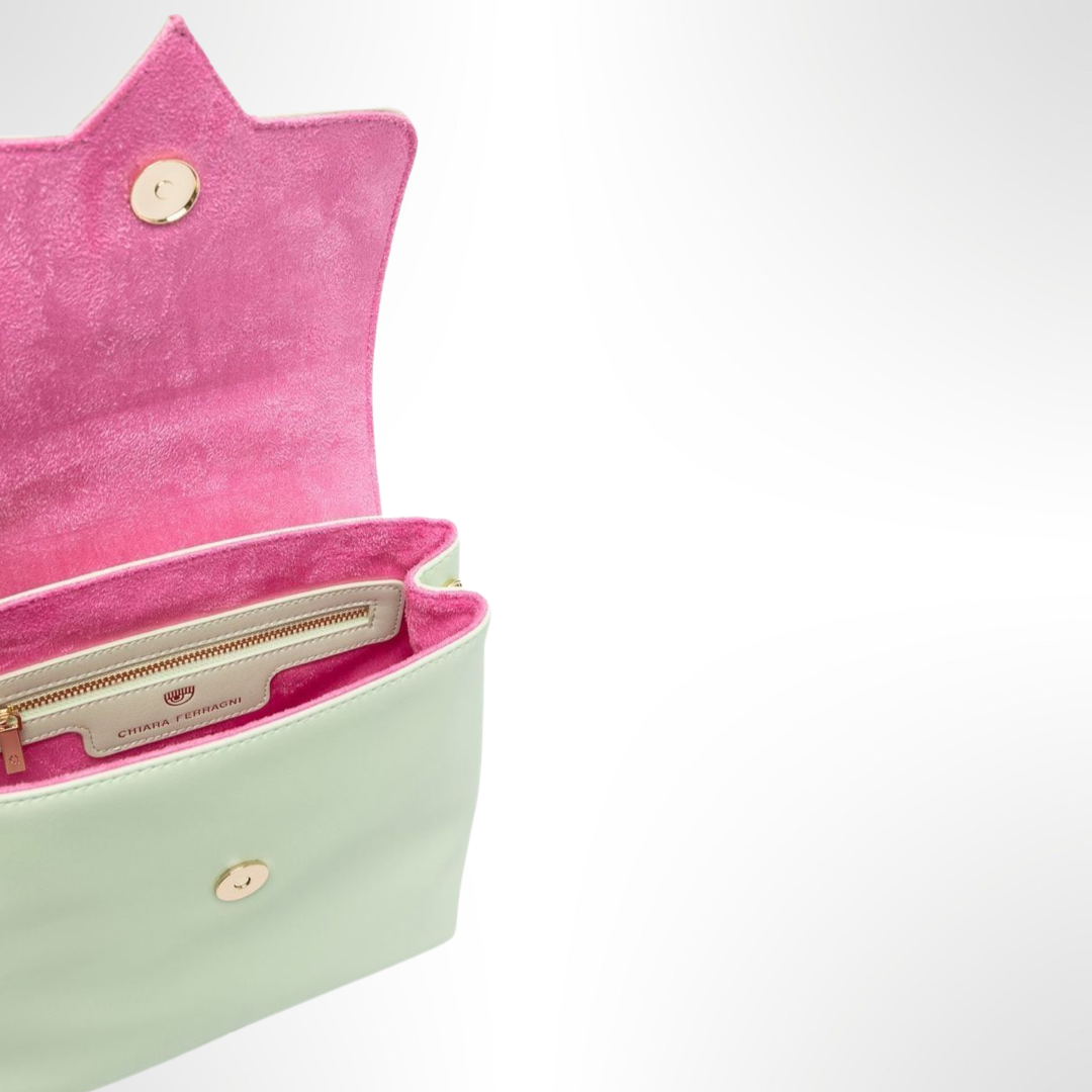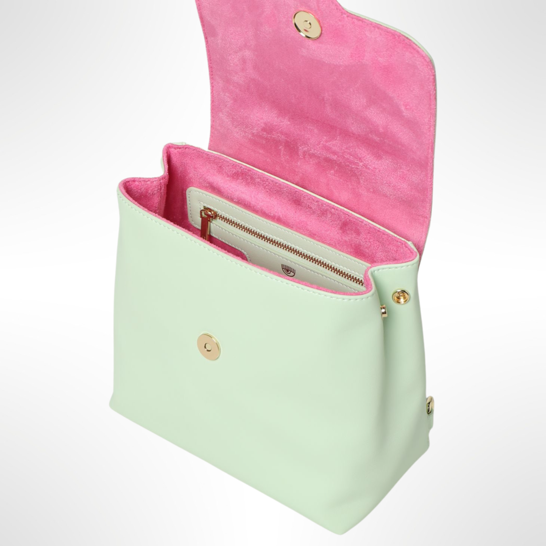 Reconocida por su motivo Eye-Like, esta mochila de Chiara Ferragni muestra el logotipo del ojo en relieve en la parte delantera en un tono tonal, que complementa su diseño verde menta. Posee un asa para llevar de mano, y otras dos extraíbles para llevar como mochila.