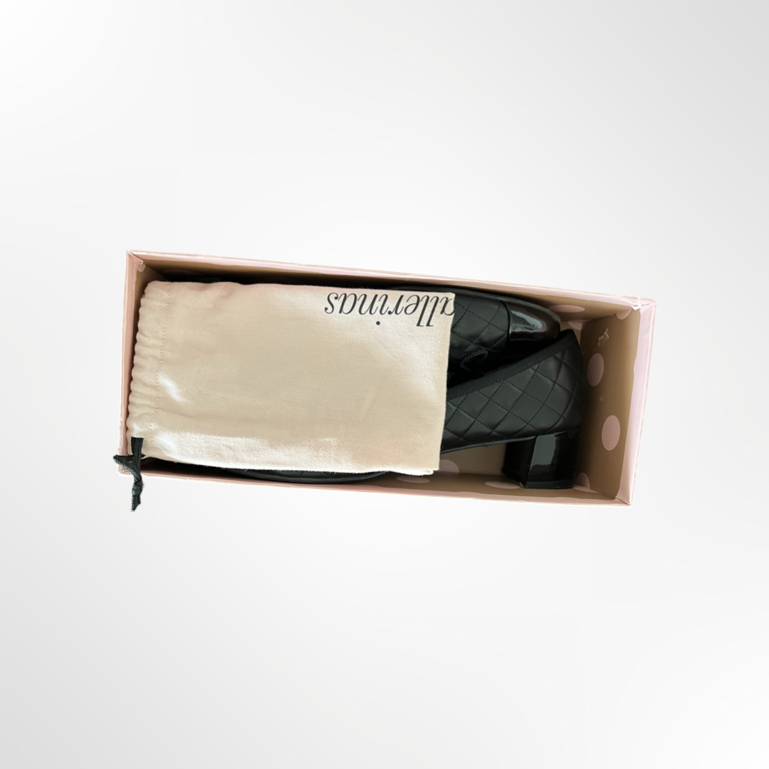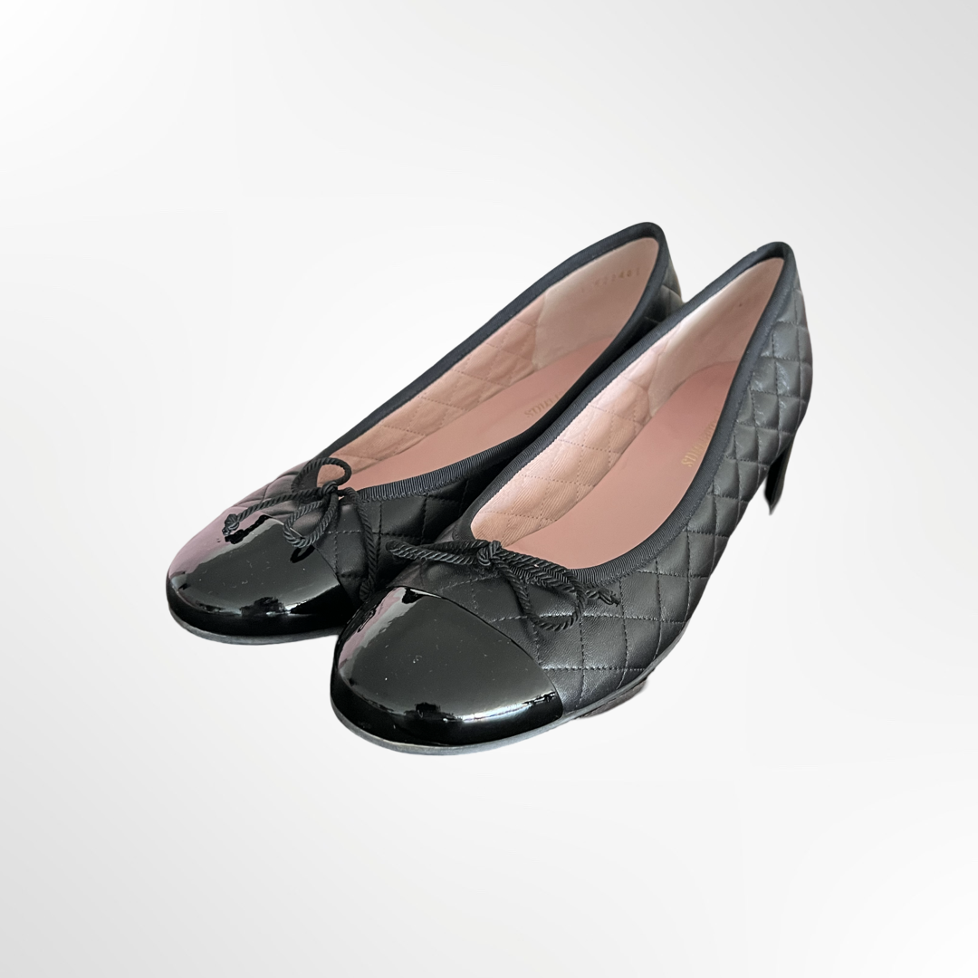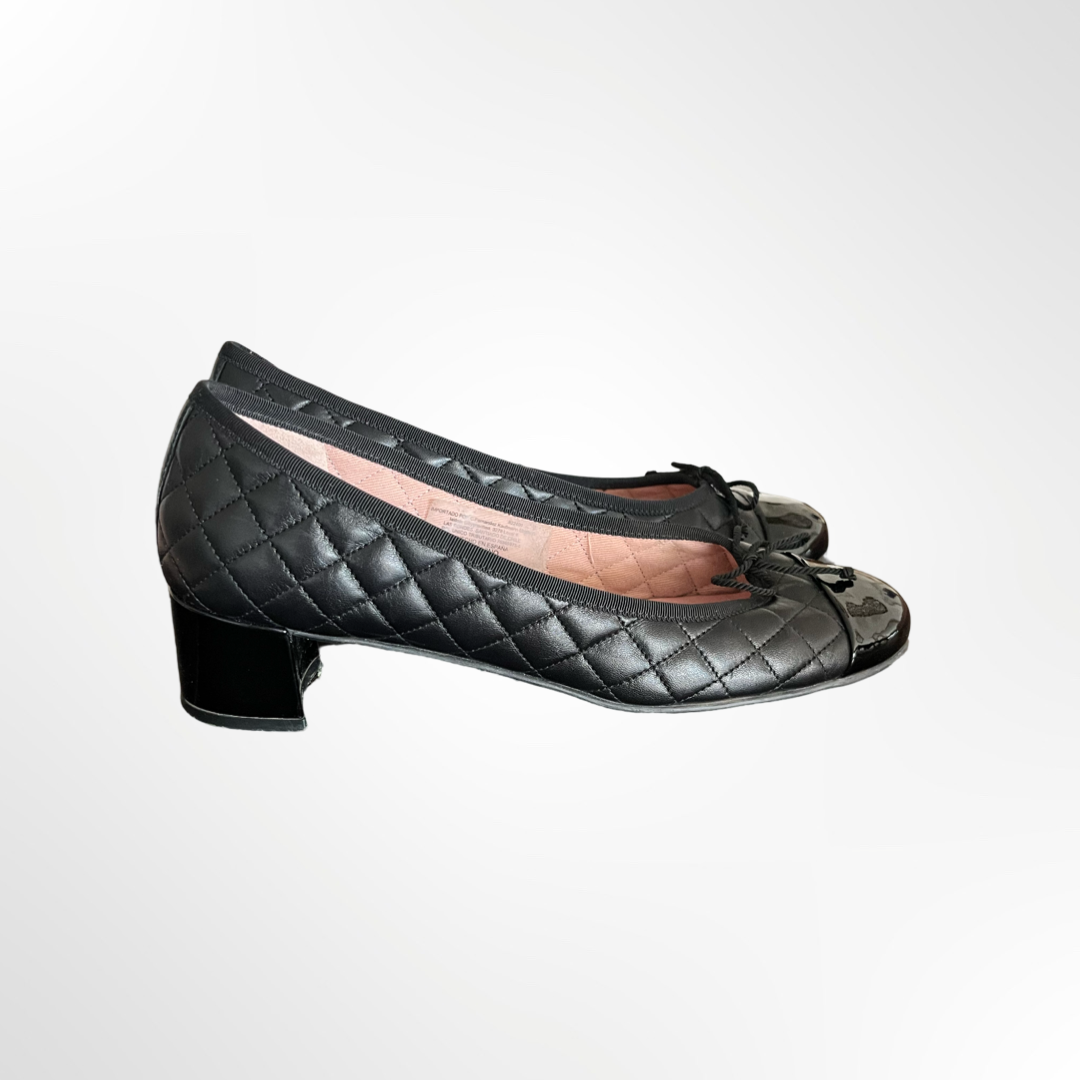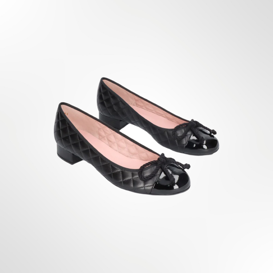 Bailarina modelo Gretschen en napa acolchada negra con puntera de charol, lazo negro y tacón de 2.5cm, suela de goma, plantilla de piel y forro de tela.