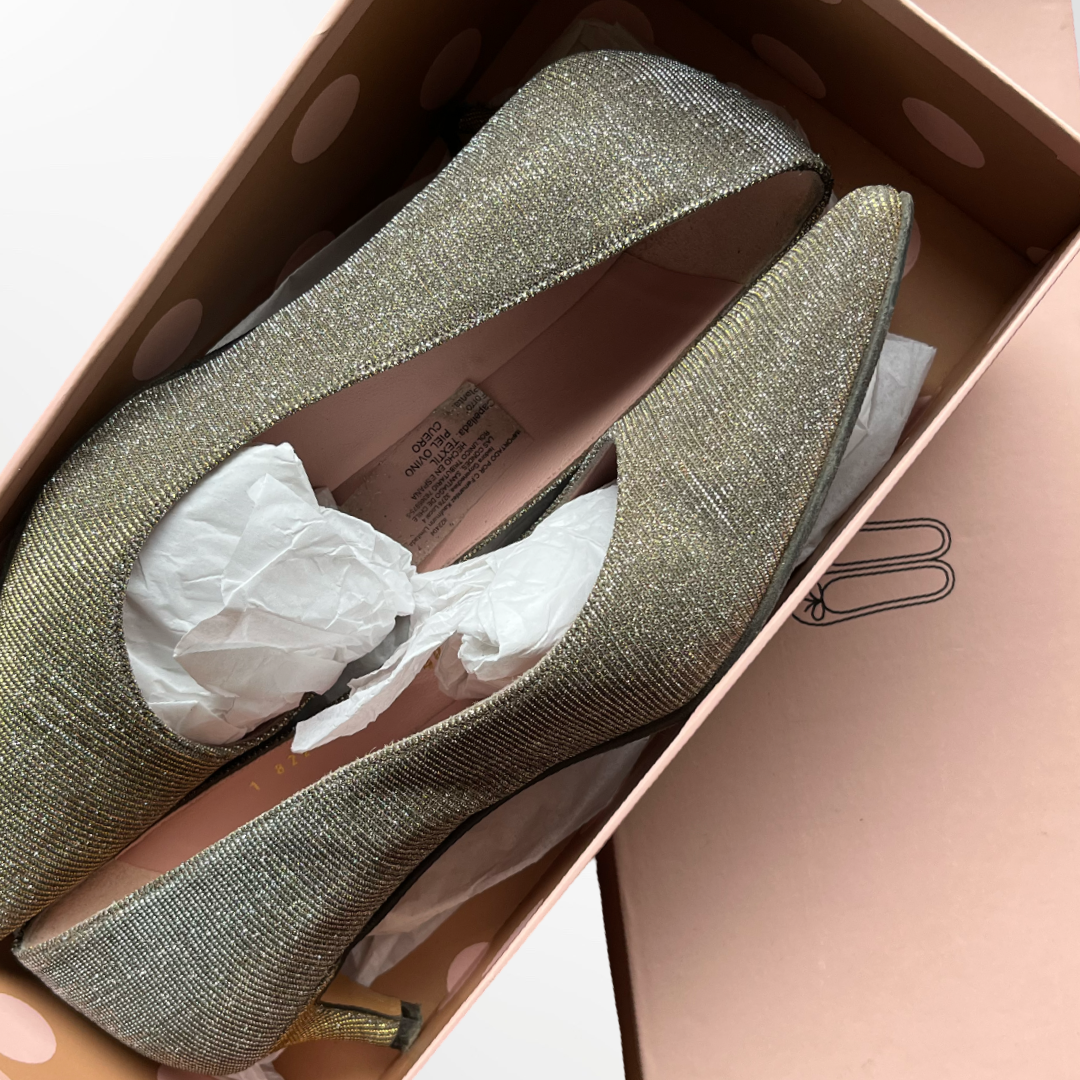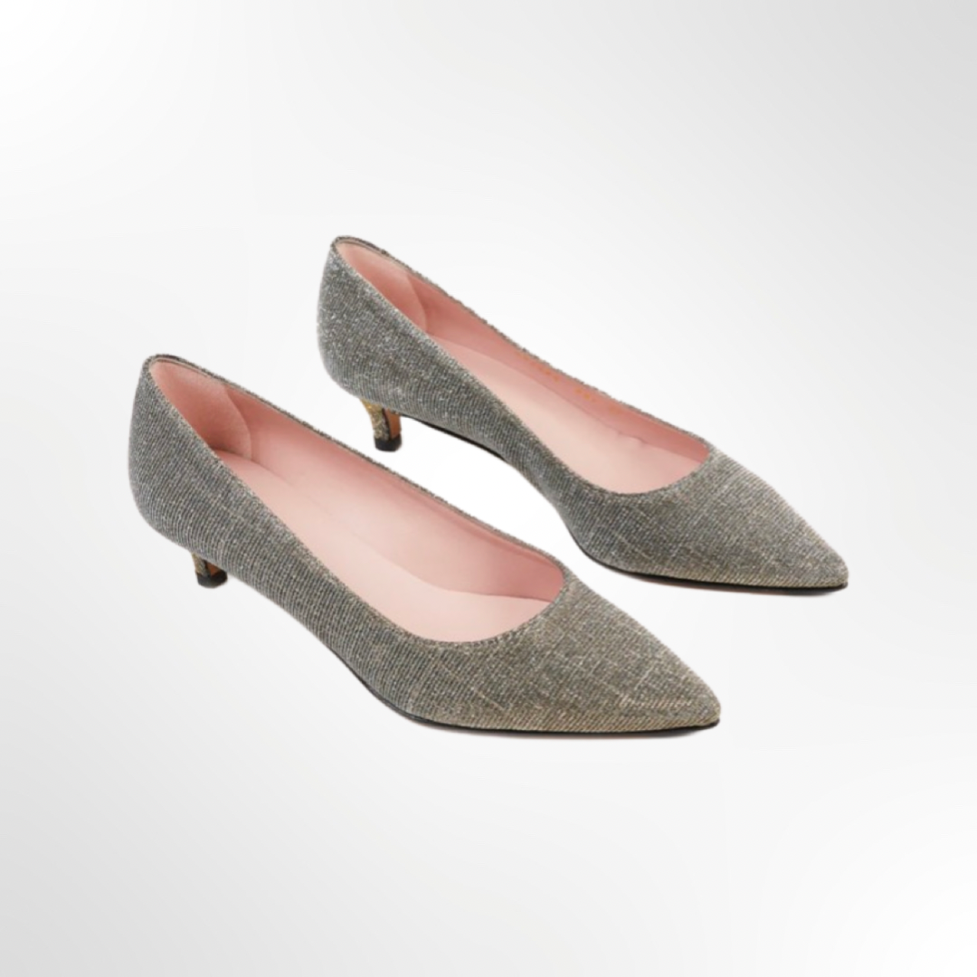 Género metalizado en tonos plateados y dorados, según la luz. Tacón de 3 cm.