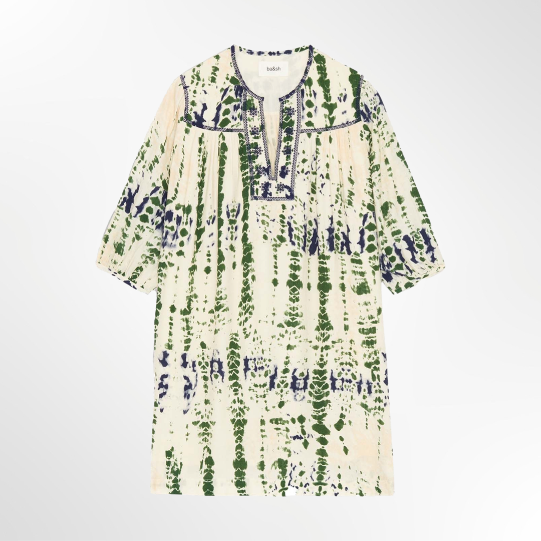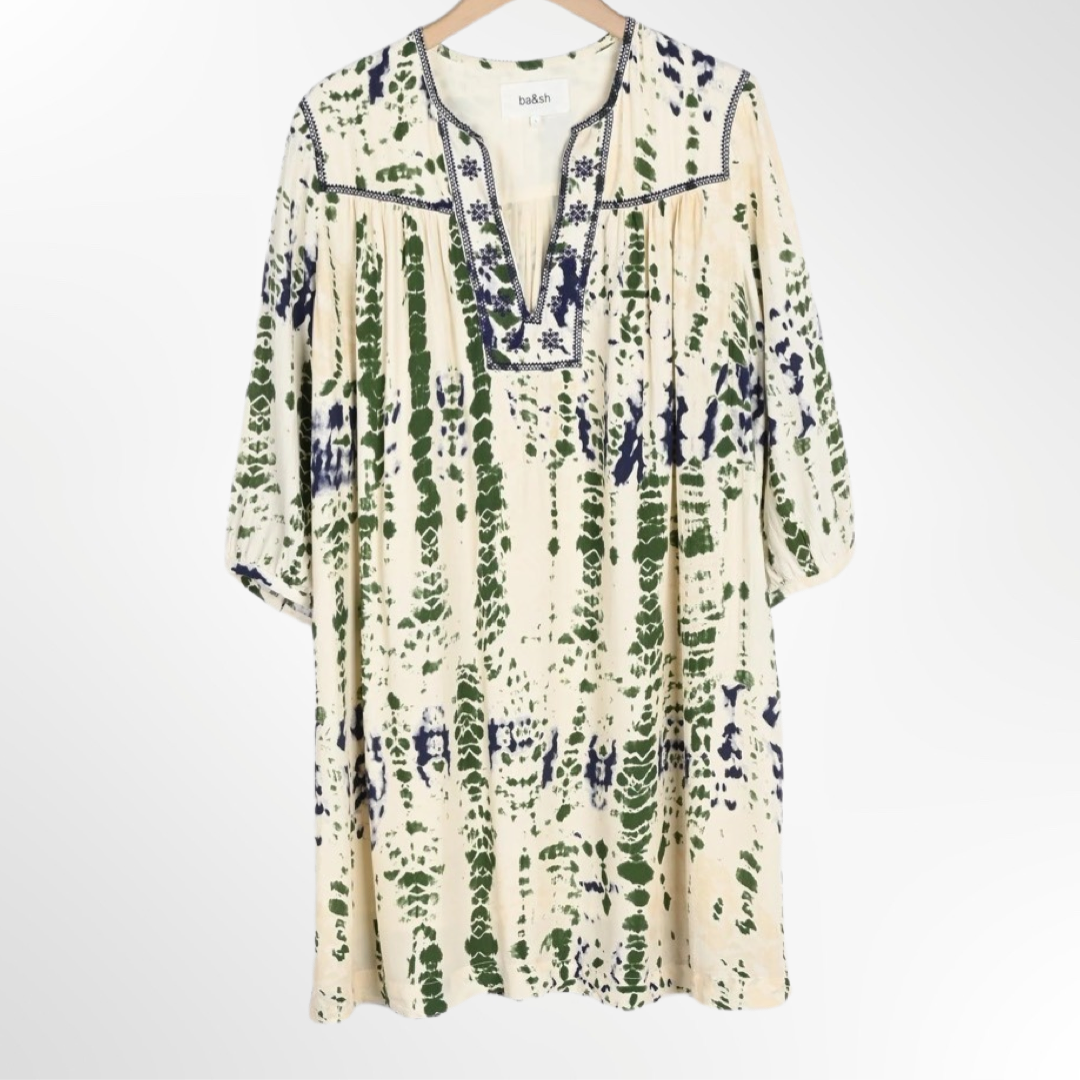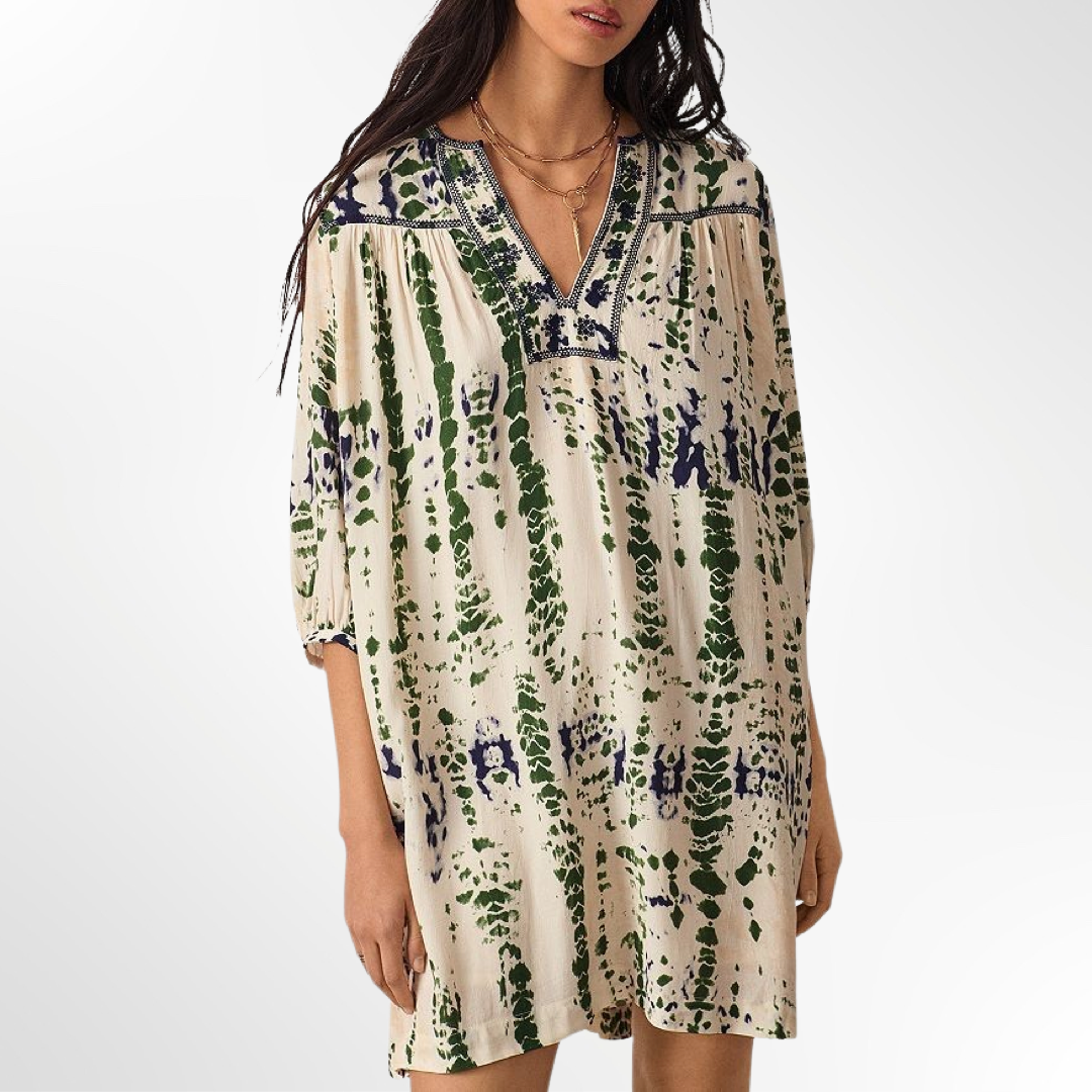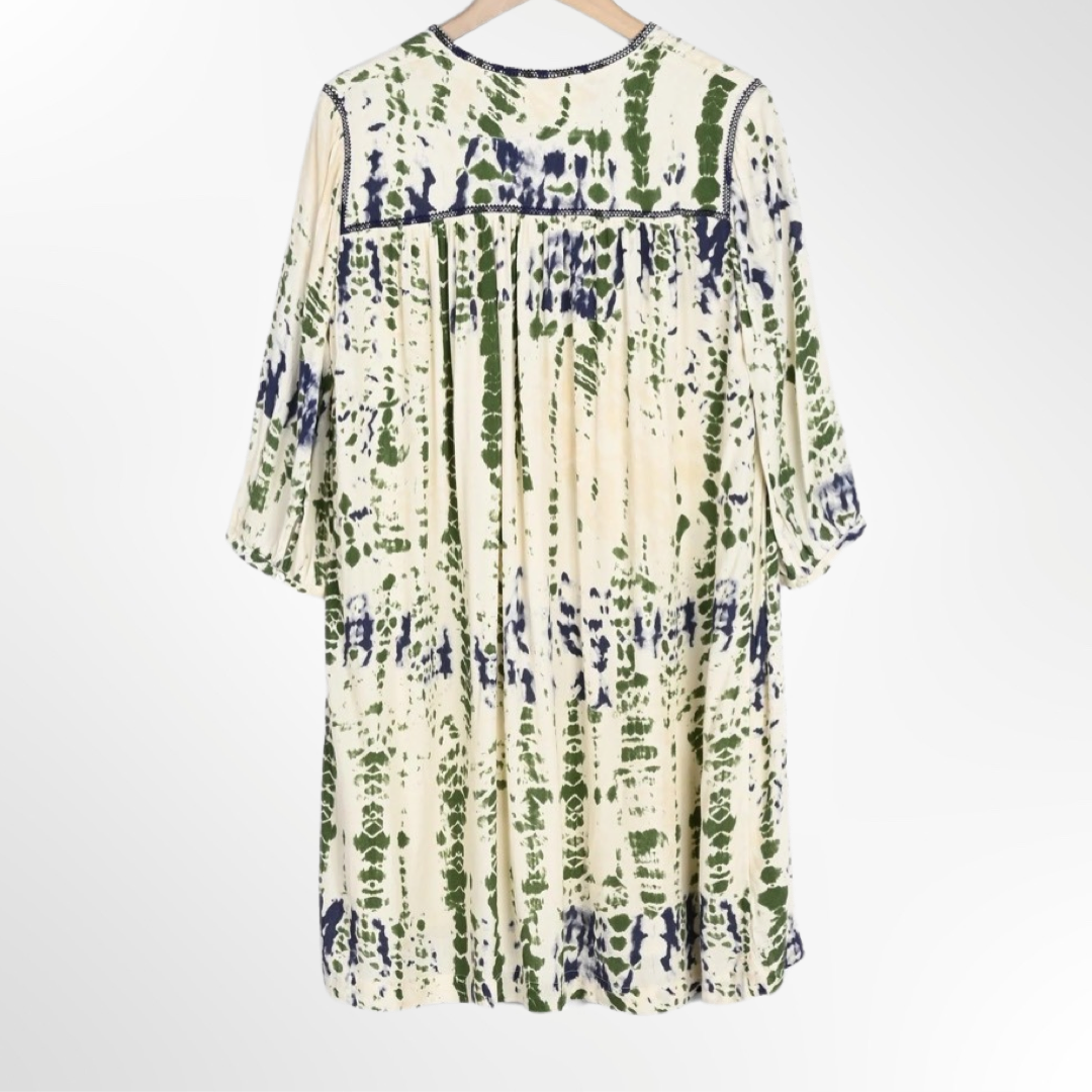 Vestido corto tipo túnica, blanco tie dye escote en V y manga 3/4.
