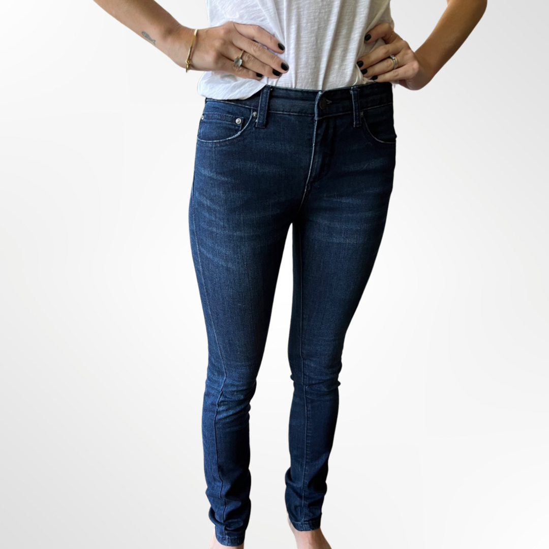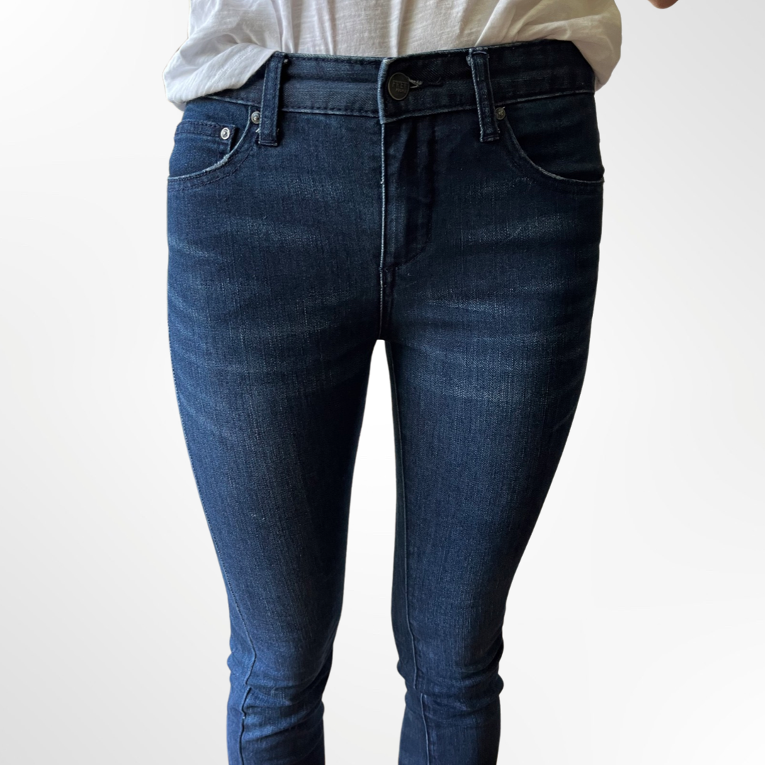 Jeans azul marino tiro medio, bolsillos delanteros y traseros. Ajustados y rectos.