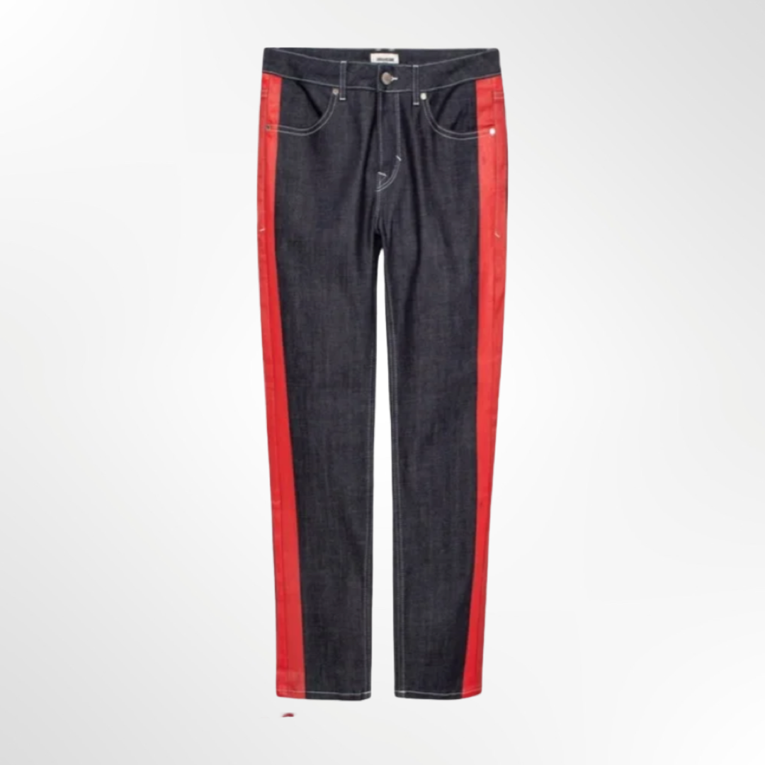 Jeans dark blue con franja roja a los costados. Estilo boyfriend.