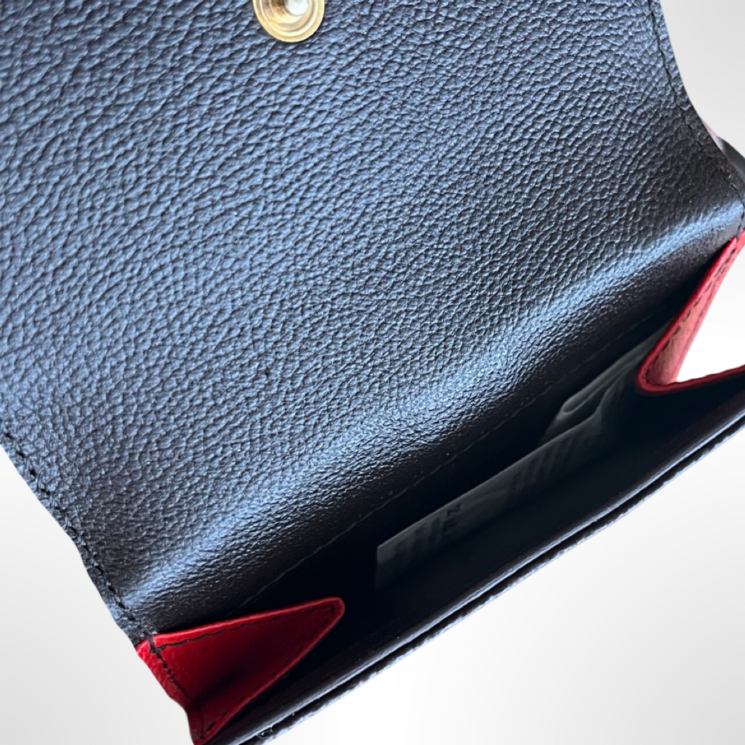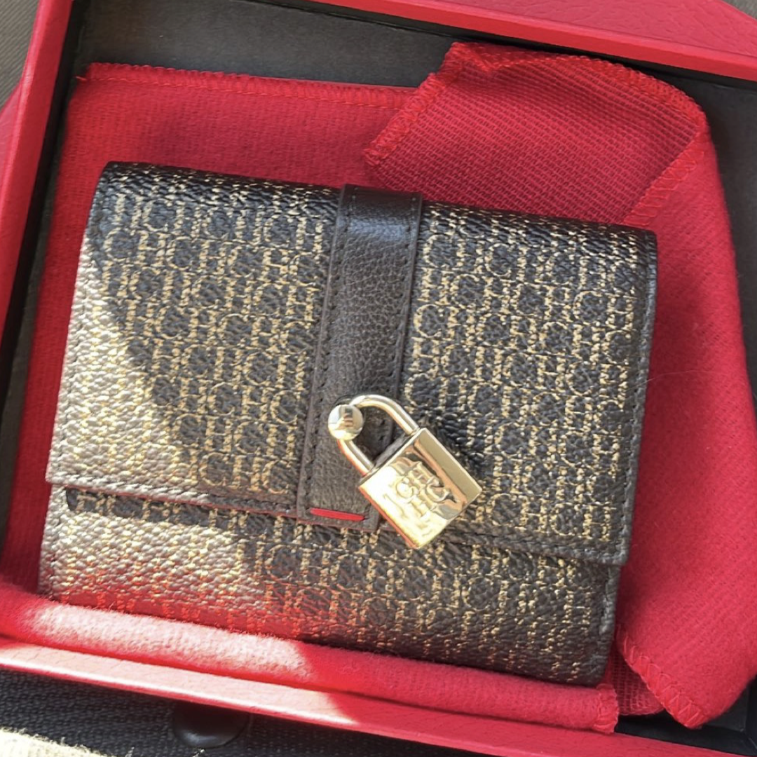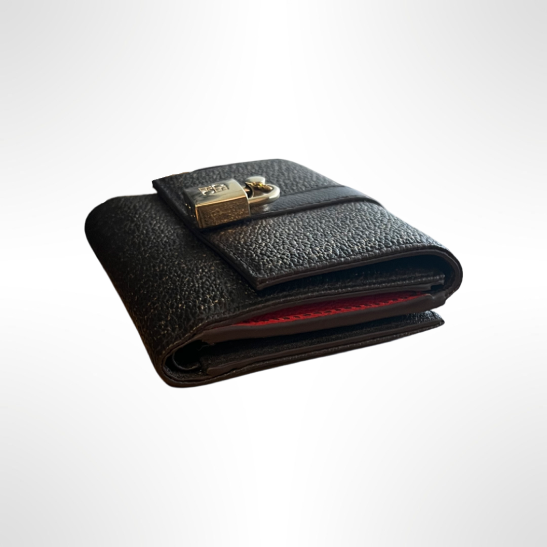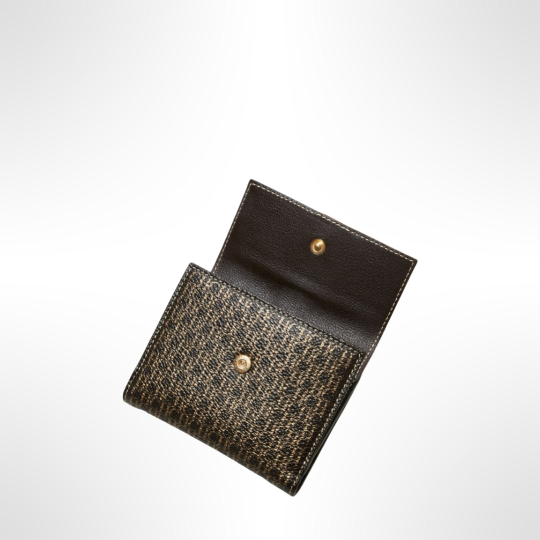 Monedero en lona El Dorado y Caracas Traveler con detalle de correa de piel a contraste y candado personalizado. Bolsillo de solapa con cierre a presión y compartimento para tarjetas con cierre a presión. Herrajes chapados en oro.