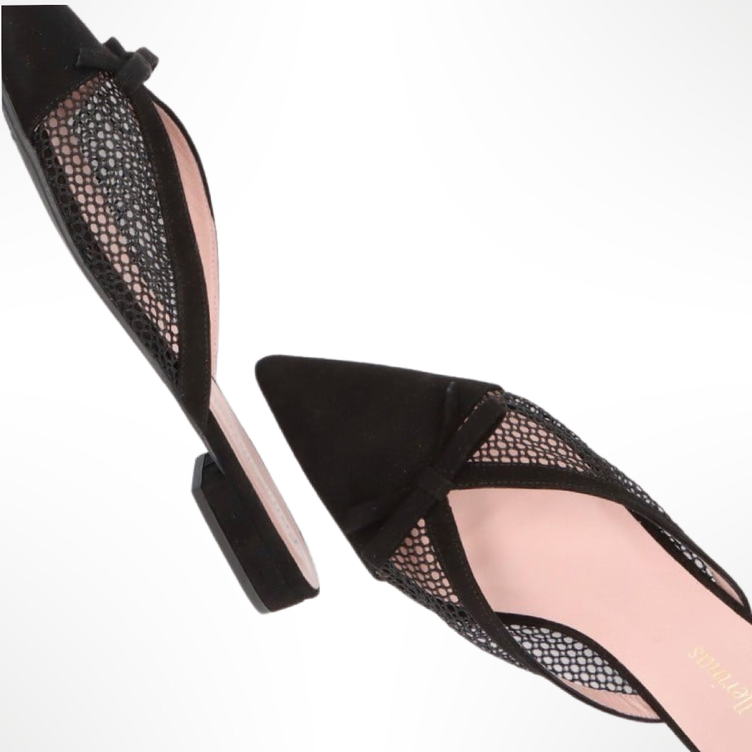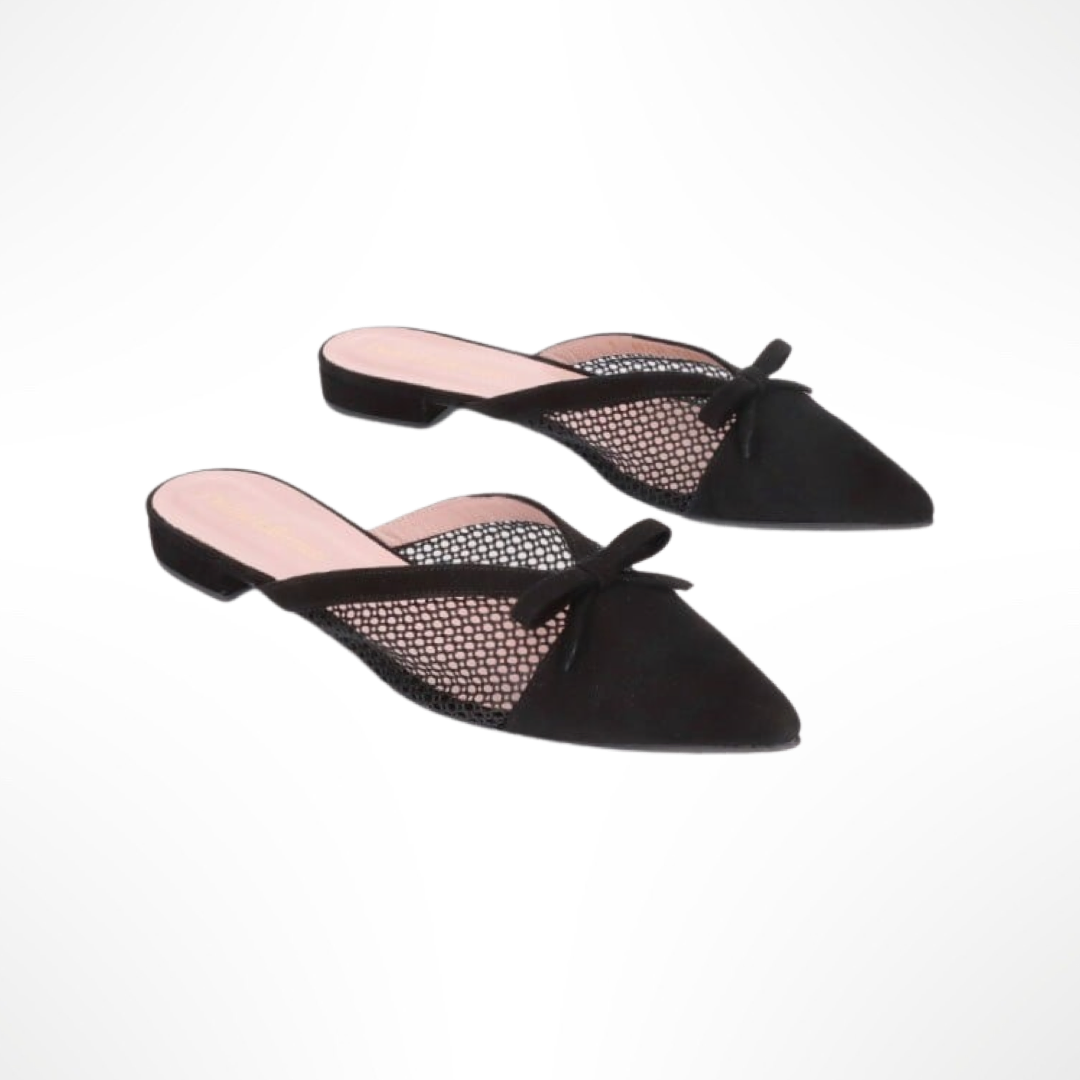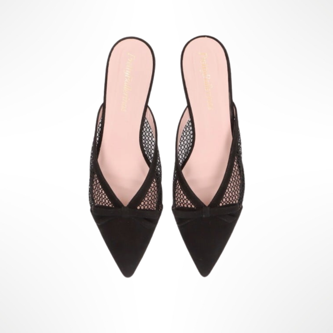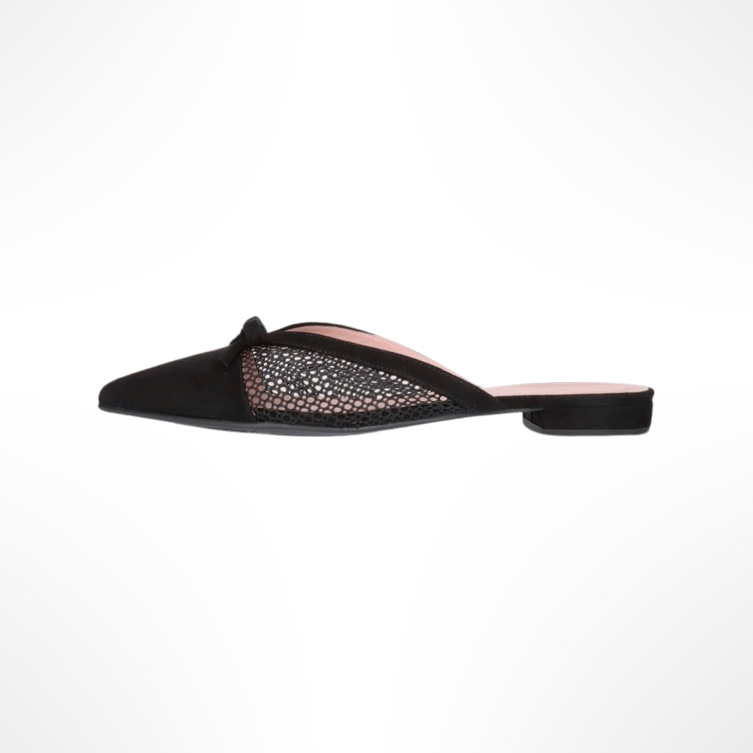 Mule de punta fina con ante de red y pequeño lazo. Tacón de 1,5 cm. Suela de goma y plantilla de piel.