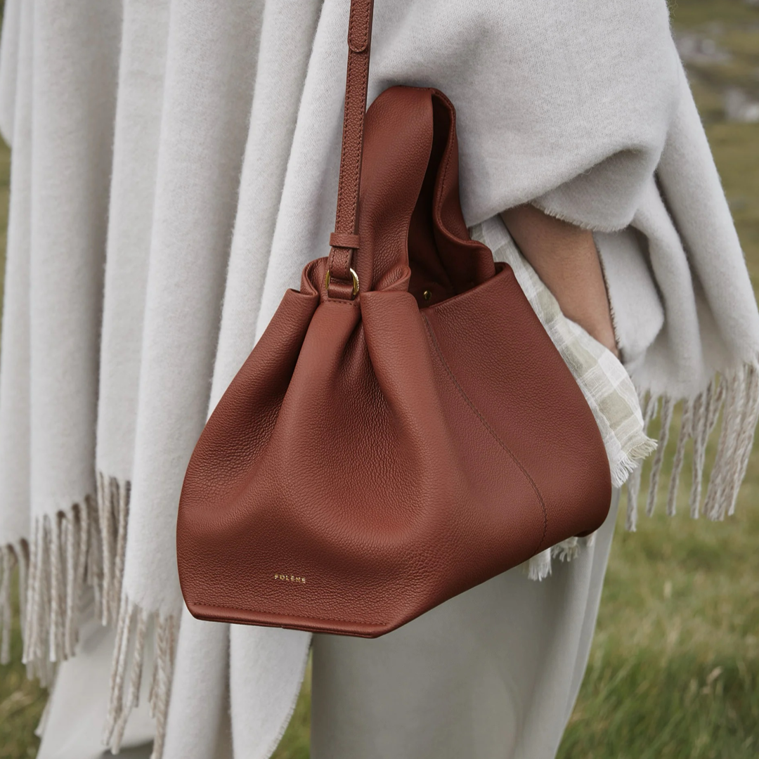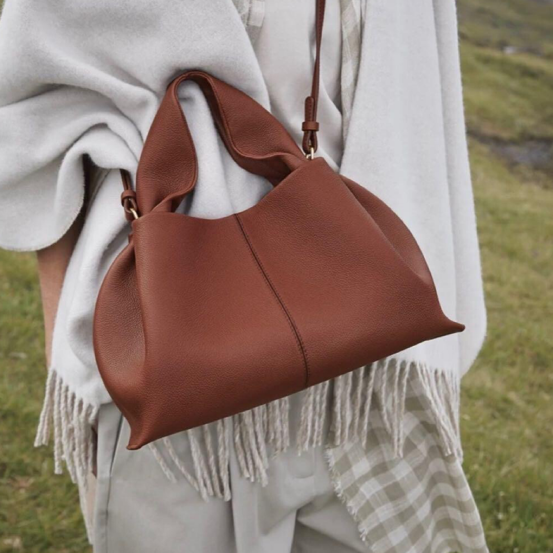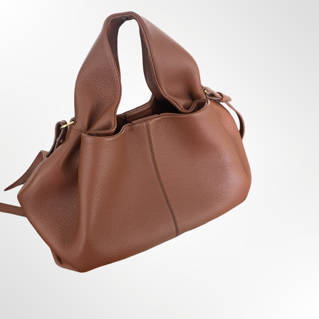 Bolso de mano, crossbody o tipo tote color cognac. Correa regulable y extraíble.