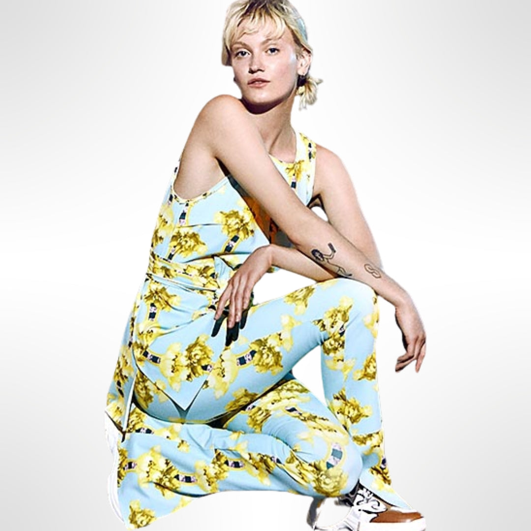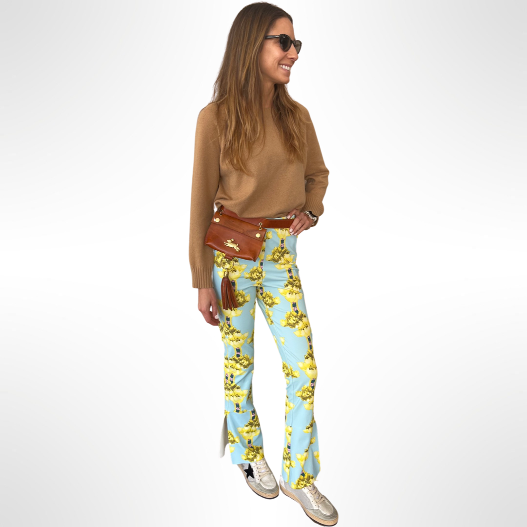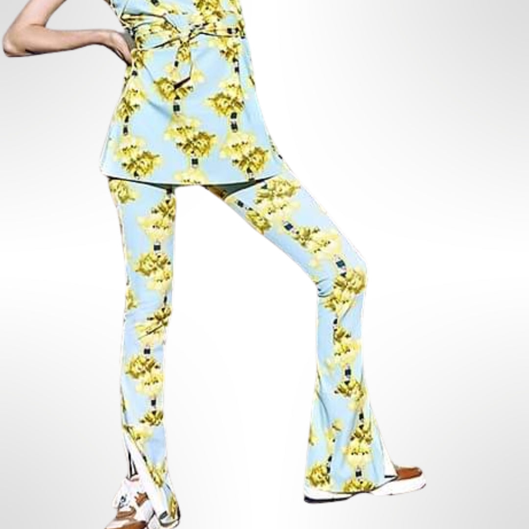 Pantalón spandex y tono celeste con flores amarillas. Corte flare con aberturas en ambas piernas. Cierre al costado.