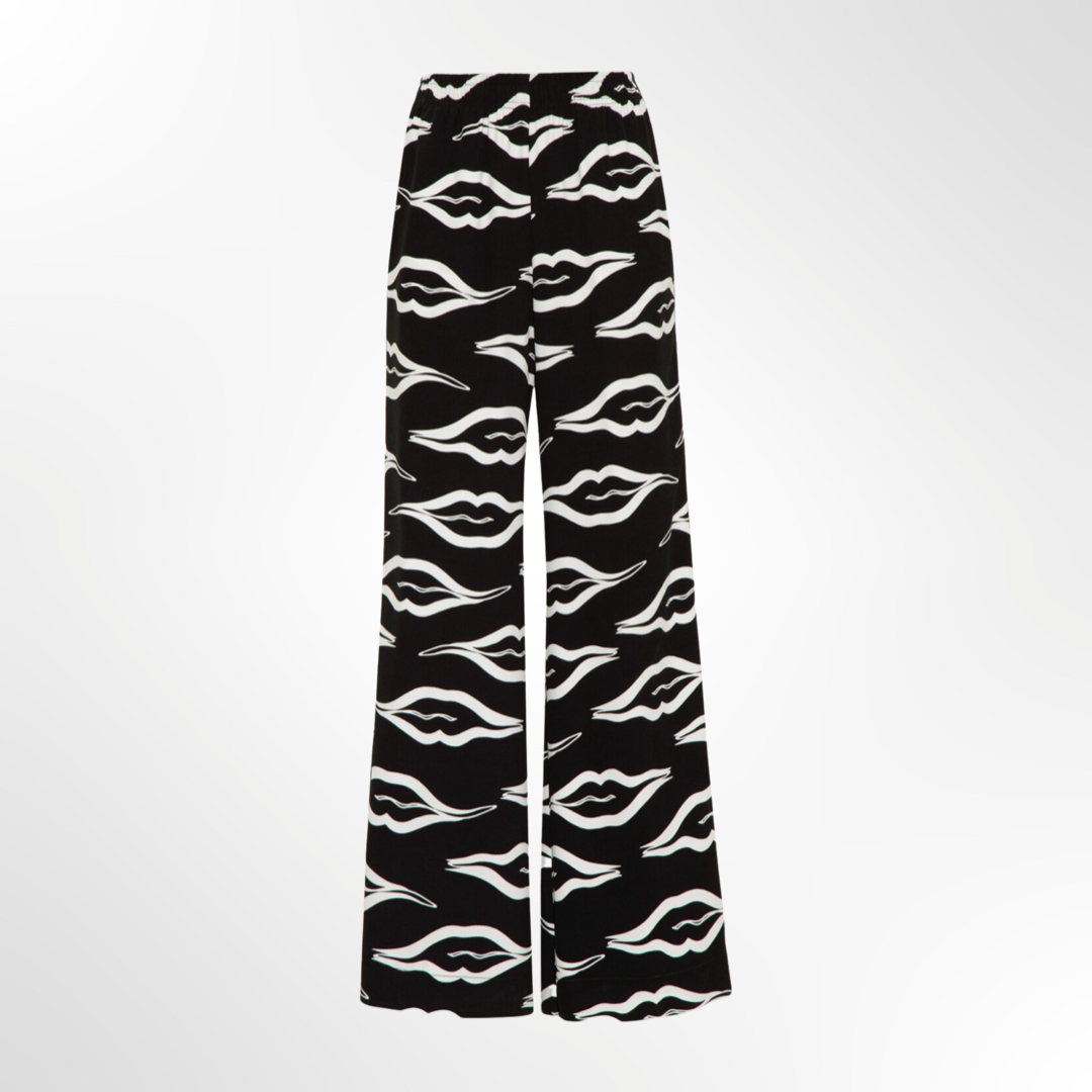 Pantalón de tiro alto confeccionado en tejido satinado con estampa Flower Kiss, exclusiva de la colección. Fit suelto y cintura con elástico interno. Abertura lateral.