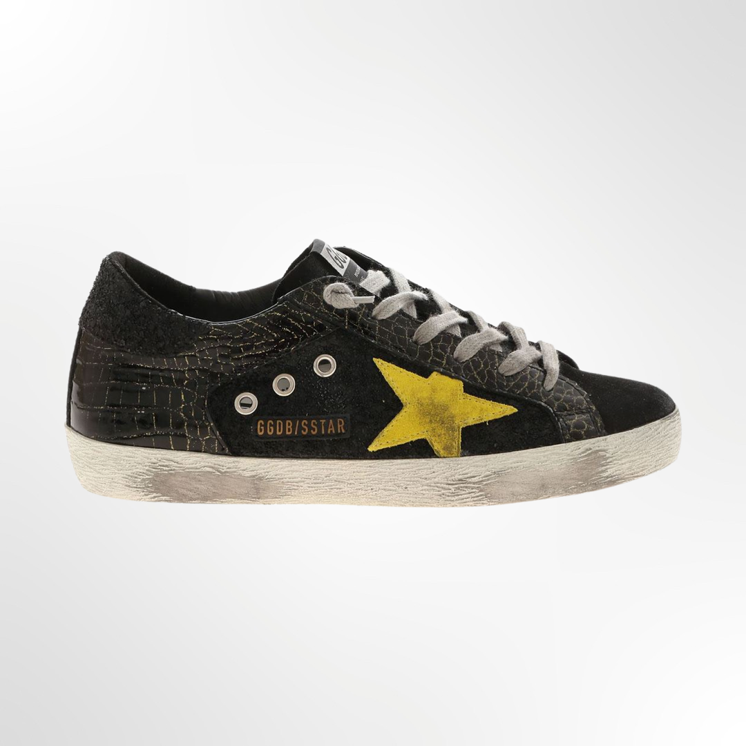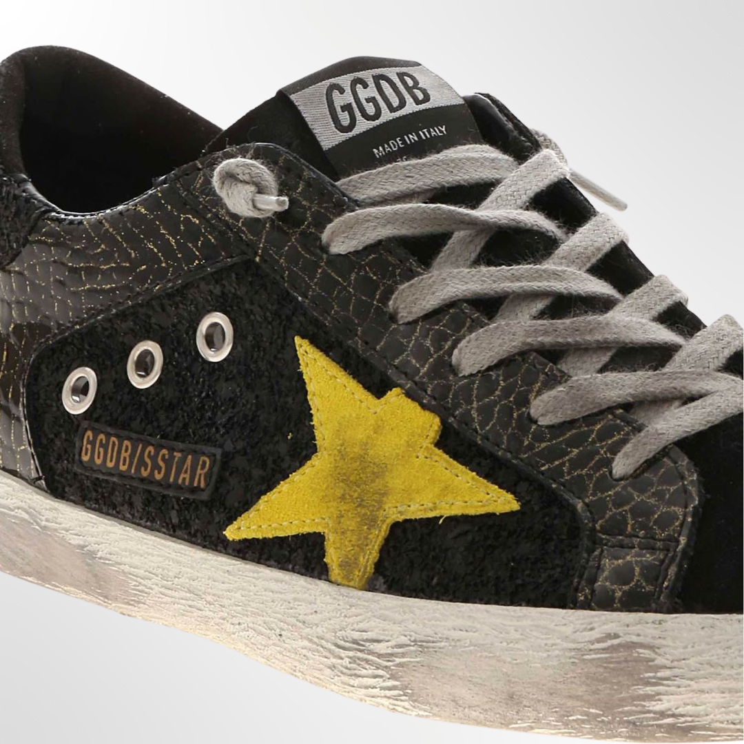 Zapatillas de cuero, gamuza y charol con estampado python, en color negro. Estrella en color fluorescente. Tacón interno.