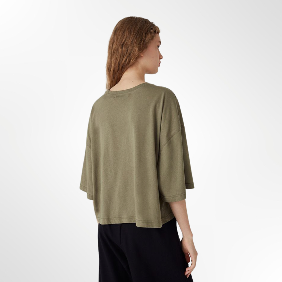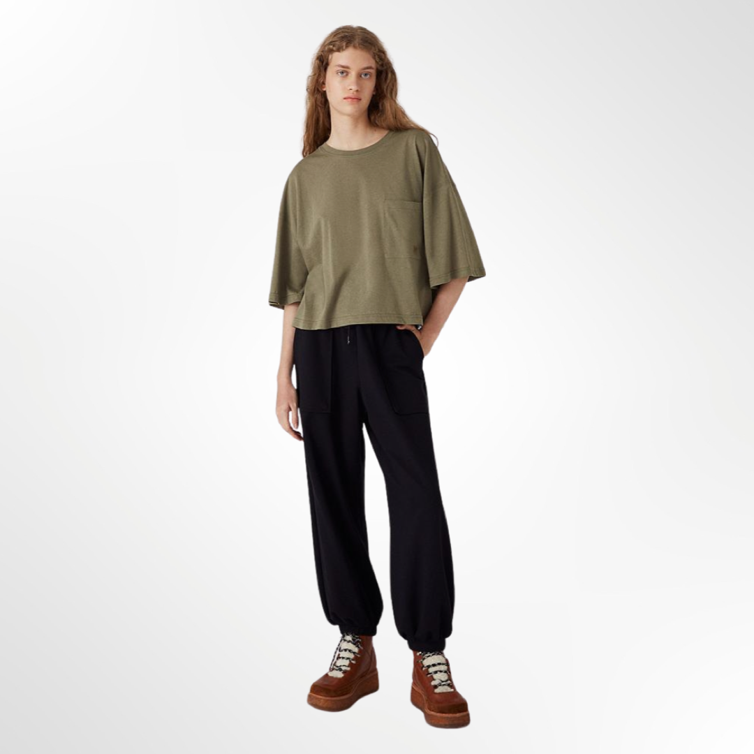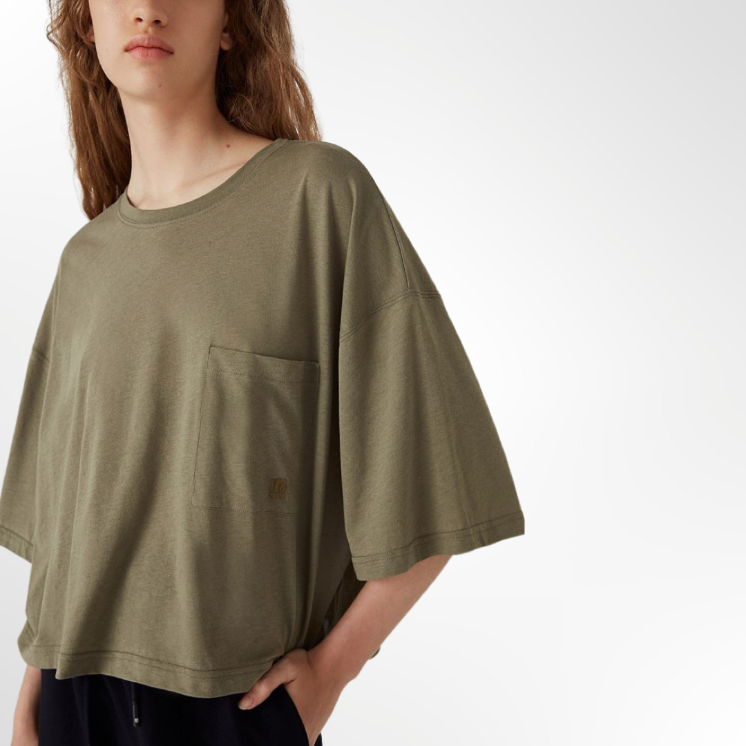 Remera de jersey de algodón pima peruano, fit boxy. Mangas cortas y escote redondo a la base. Detalle de bordado a tono en bolsillo en frente.