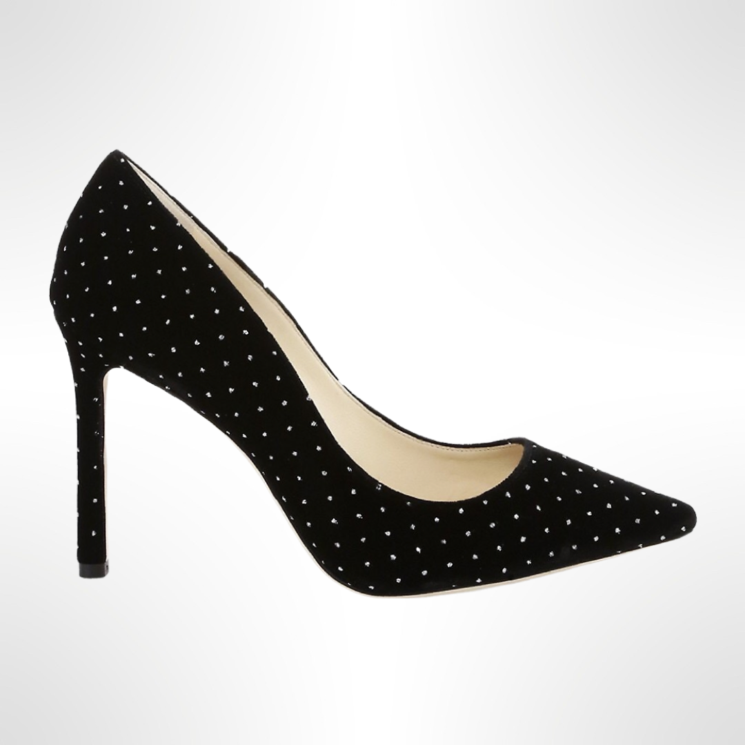 Tacón de gamuza color negro con incrustaciones brillantes. Tacón de 10 cm