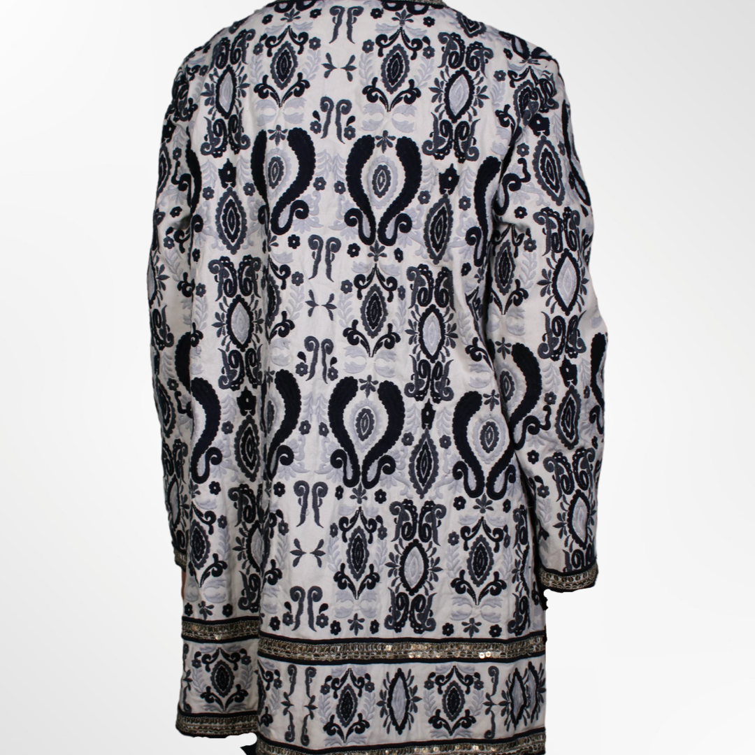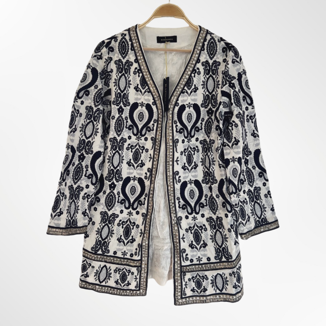 Chaqueta bordada en tonos azul, celeste, plateado.
