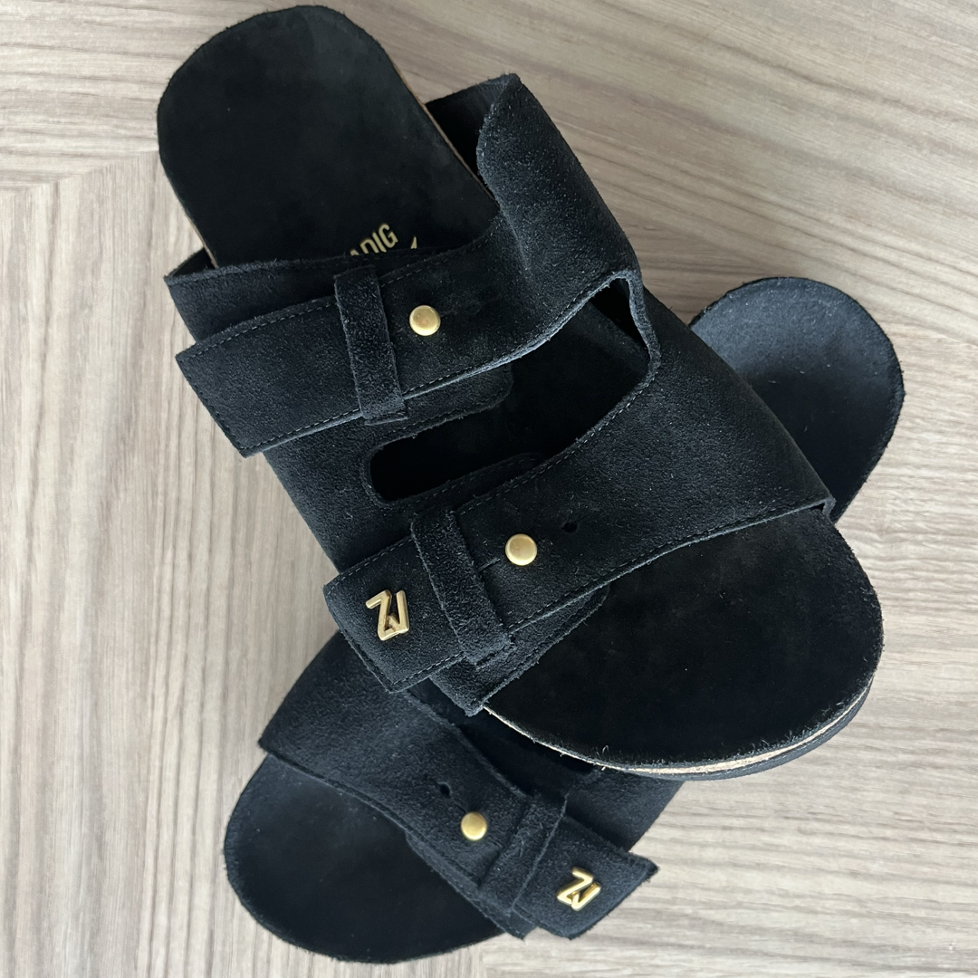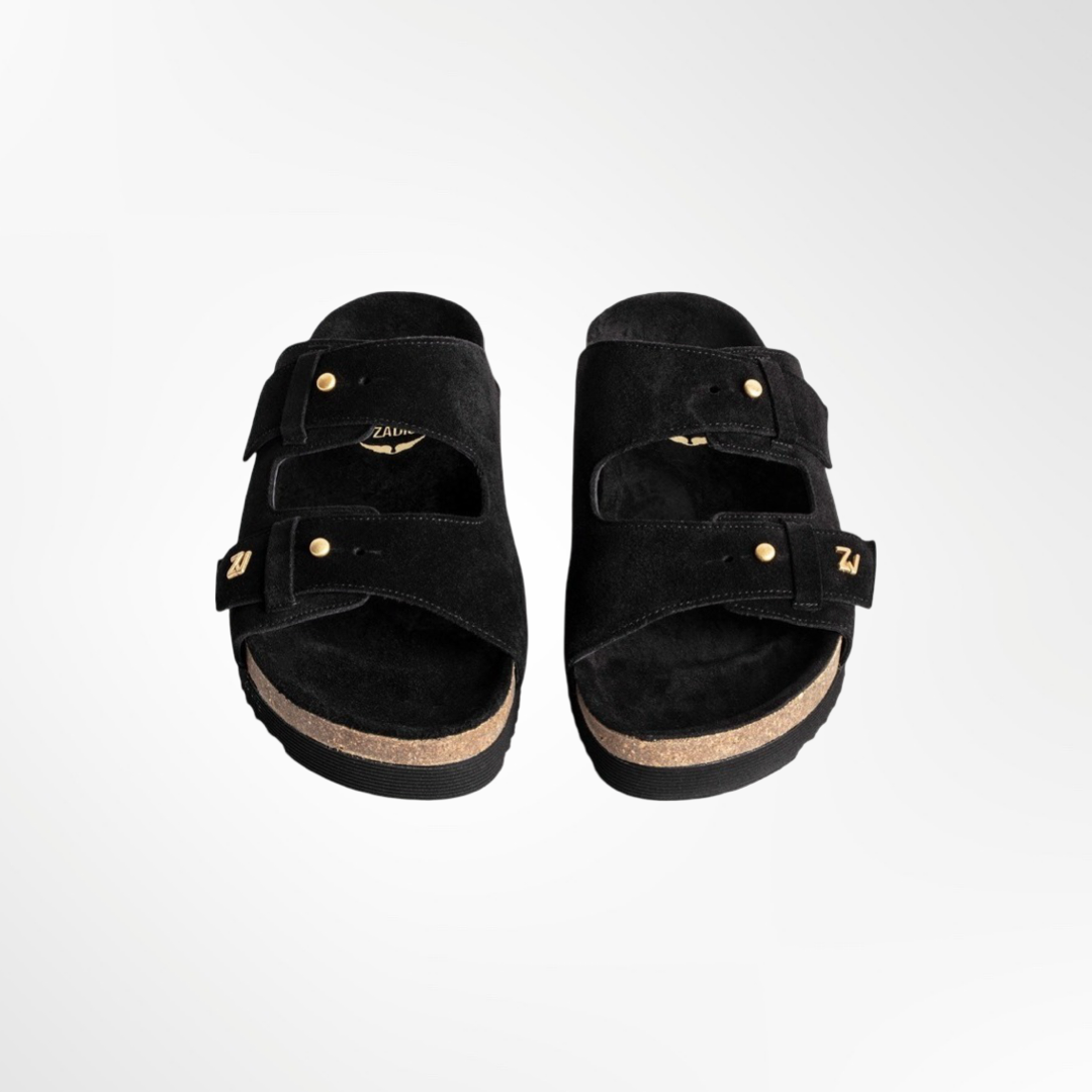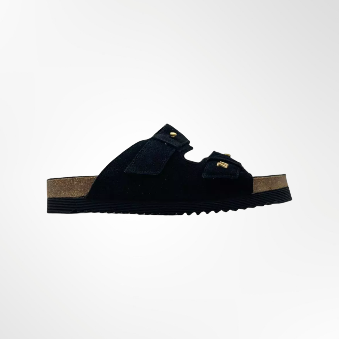 Sandalia de gamuza, ajustable y con suela de goma.