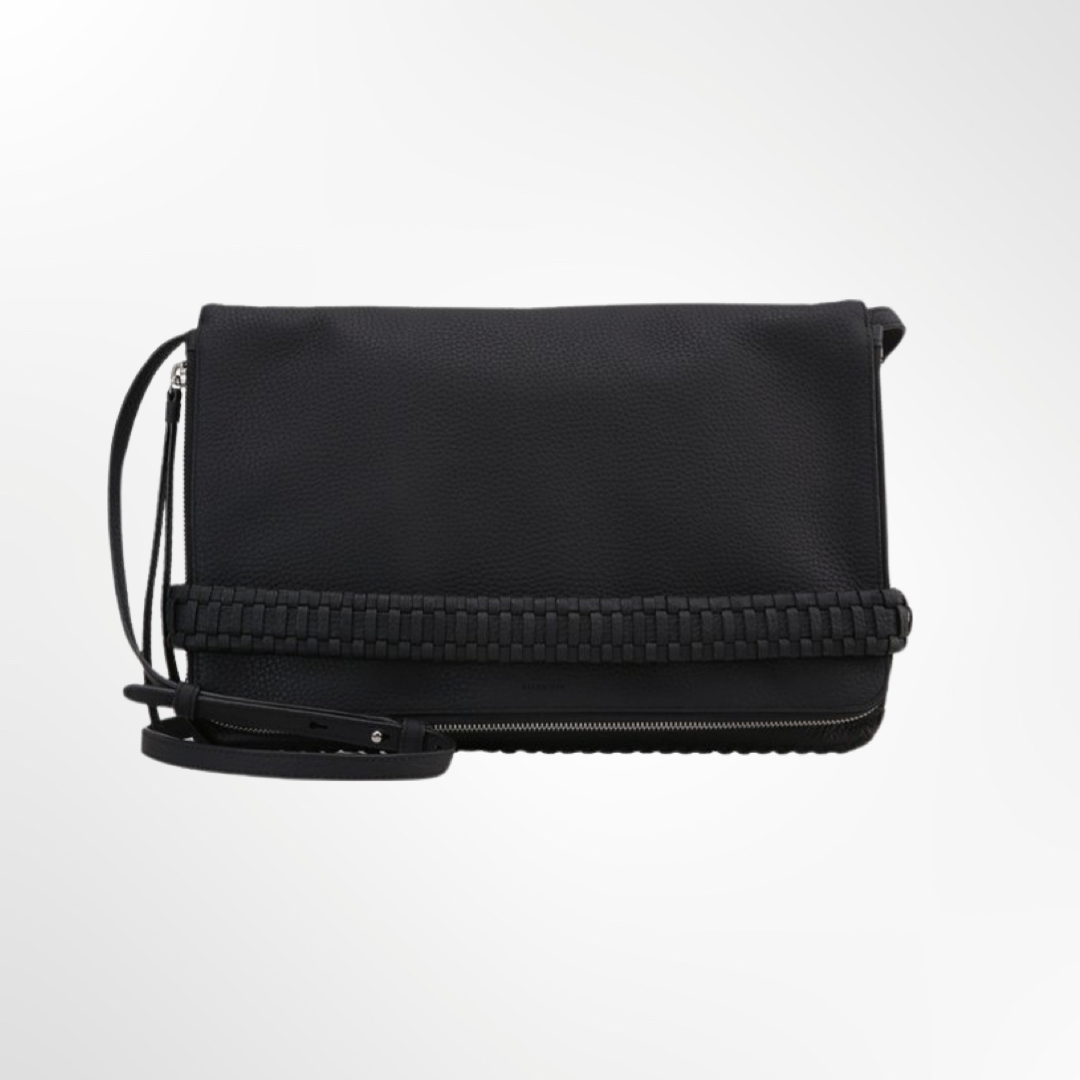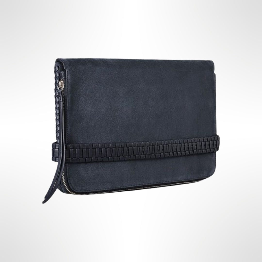 Bolso de cuero gamuza estilo sobre con strap desmontable y ajustable. Su diseño se caracteriza por detalle de trenzado. Bolsillo interior con cierre. Color: petróleo.