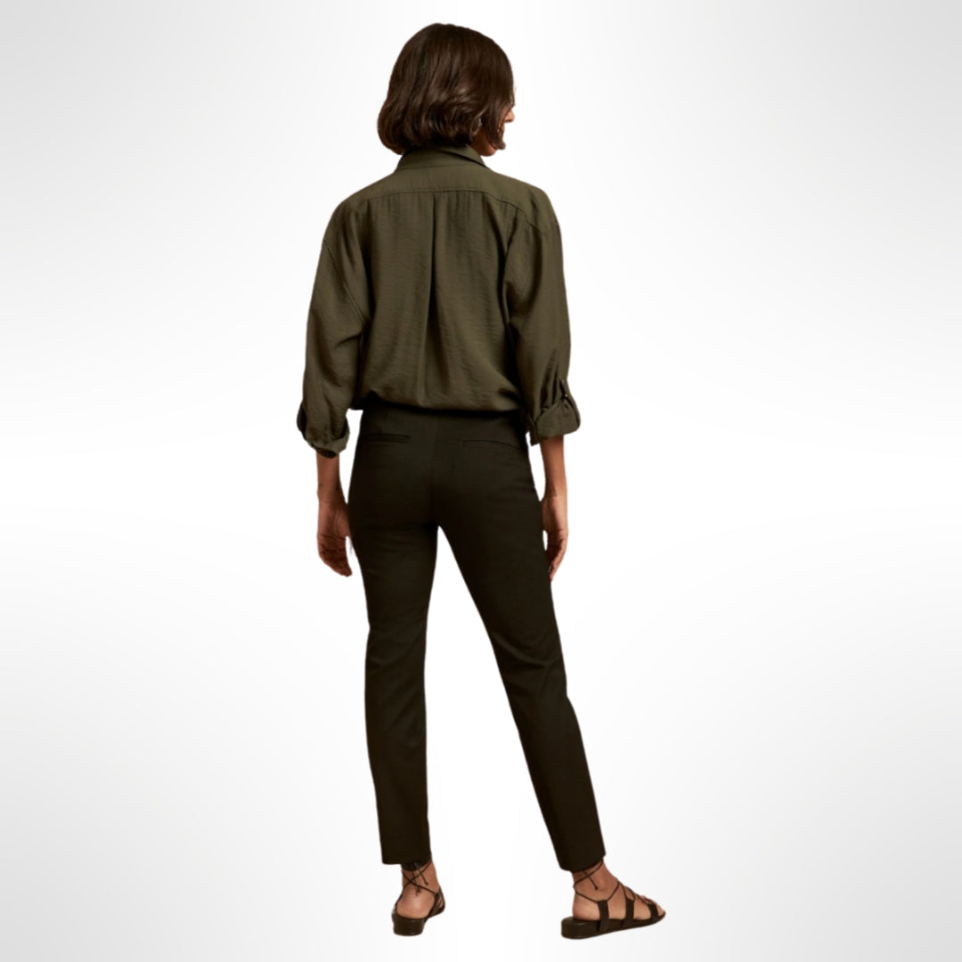 Pantalón clásico negro de tiro medio, bi-Stretch con alta elasticidad. Bolsillos delanteros y traseros.Bragueta con cremallera con corchete y cierre de barra. Sin forro.