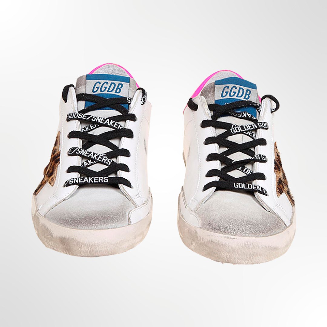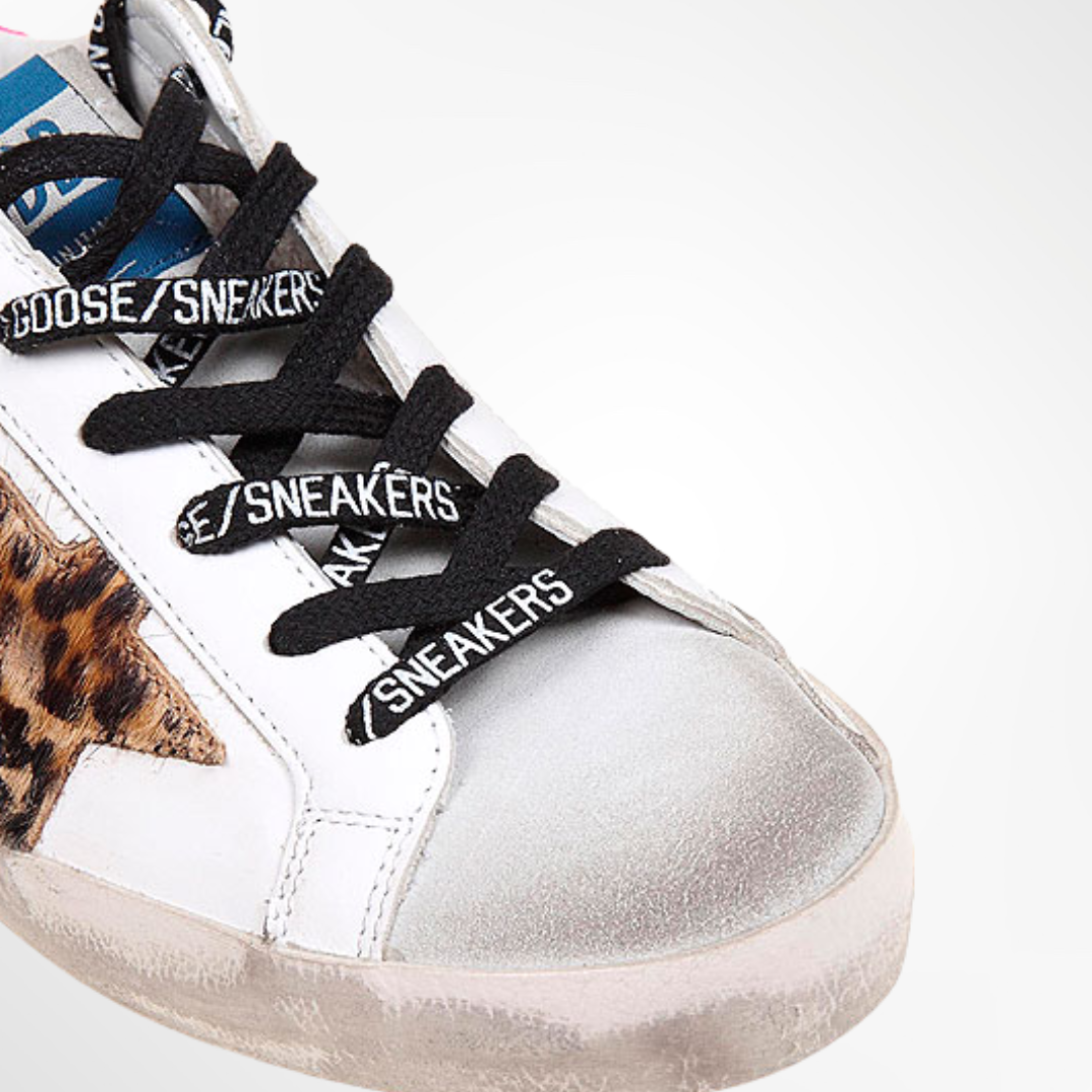 Zapatilla superstar de cuero blanca, con estrella en piel estampado leopardo, cordones negros con inscripción de la marca y parte trasera en color fucsia. Gamuza en el empeine. Tratamiento vintage.