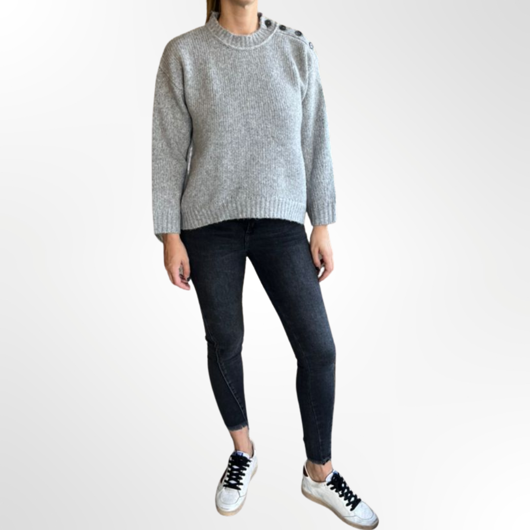 Sweater gris de lana con botones sobre el hombro izquierdo.