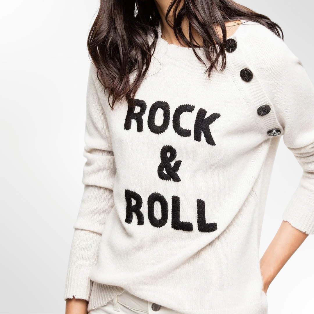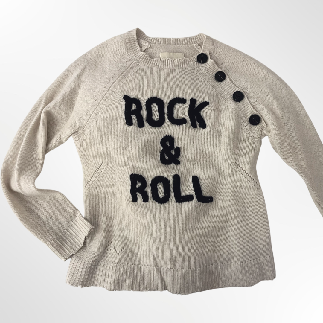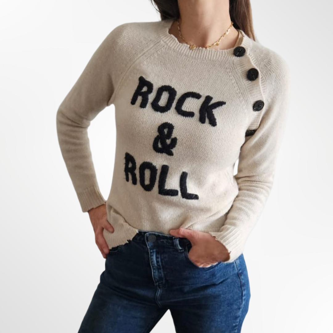 Sweater crudo con inscripción Rock And Roll en negro, cuello redondo y manga larga.