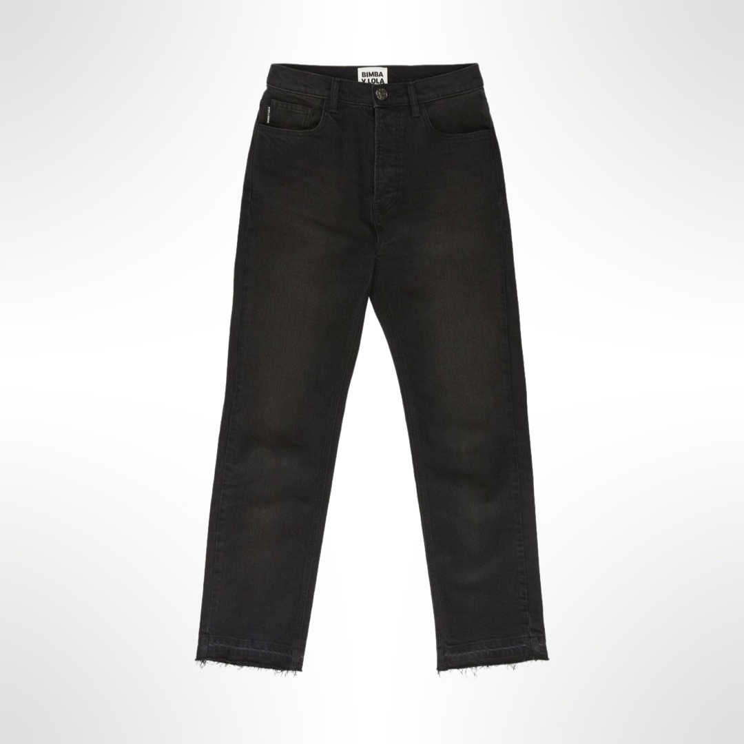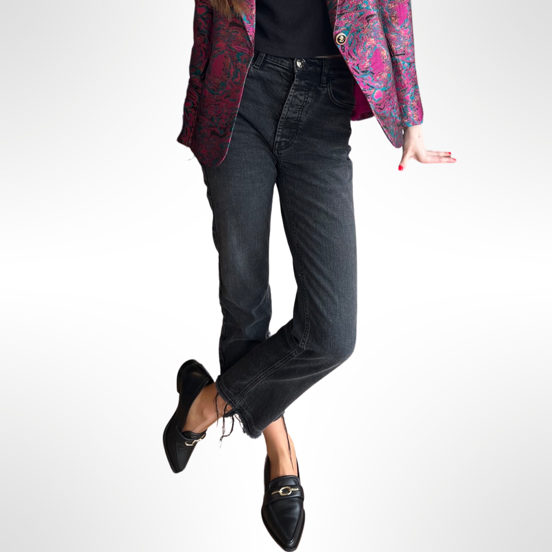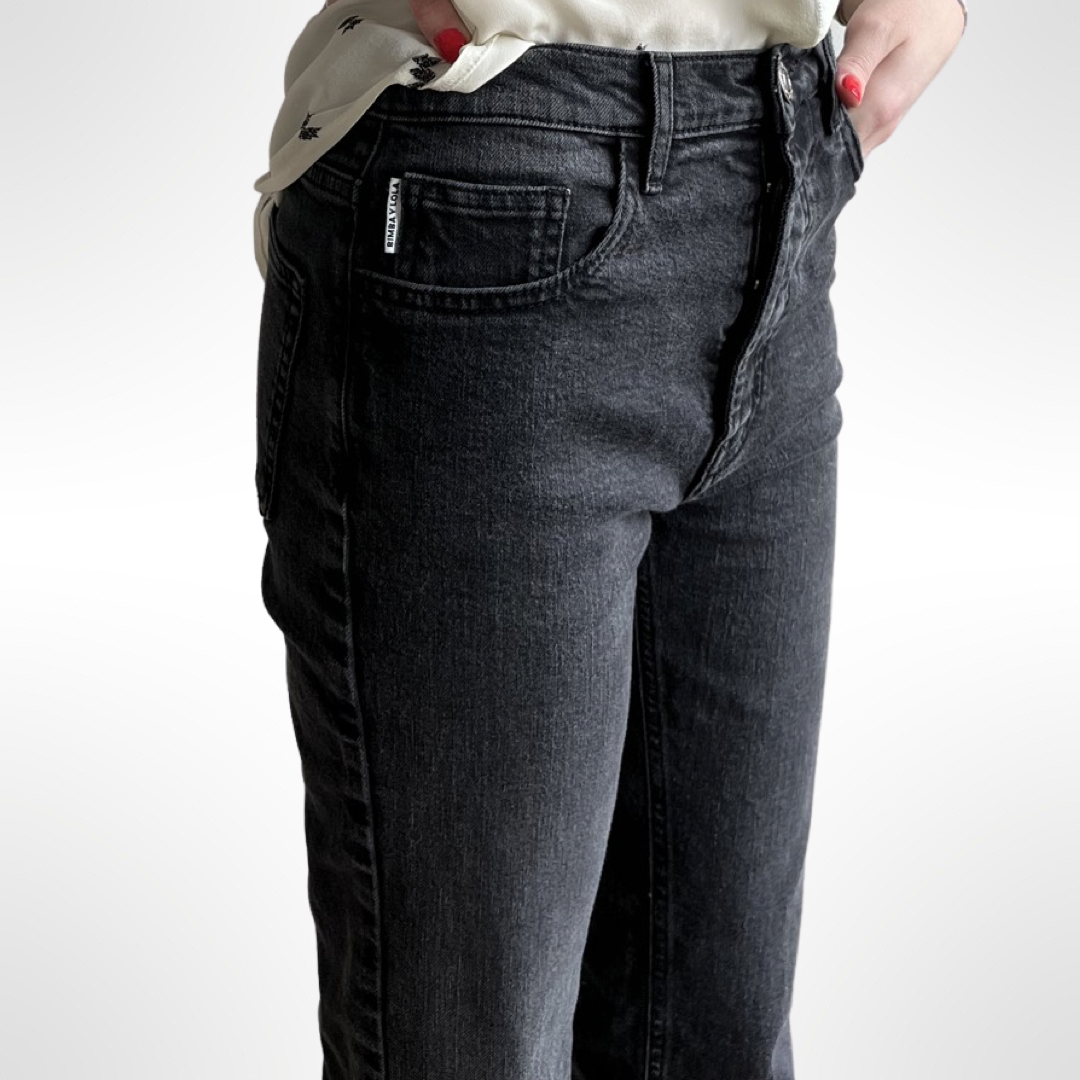 Pantalón bootcut en color gris oscuro. Modelo de corte recto, tiro alto y con bolsillos frontales y posteriores. Cierre de cremallera con botón personalizado y trabilla para cinturón.