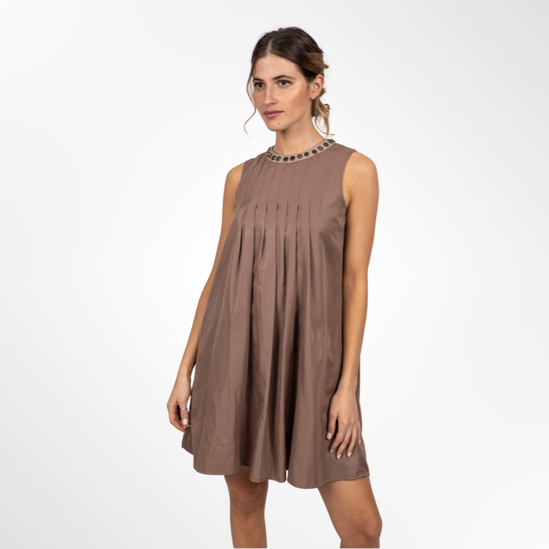 Vestido beige con cinturón removible de cuero trenzado. Cuello redondo cerrado con incrustaciones metálicas.