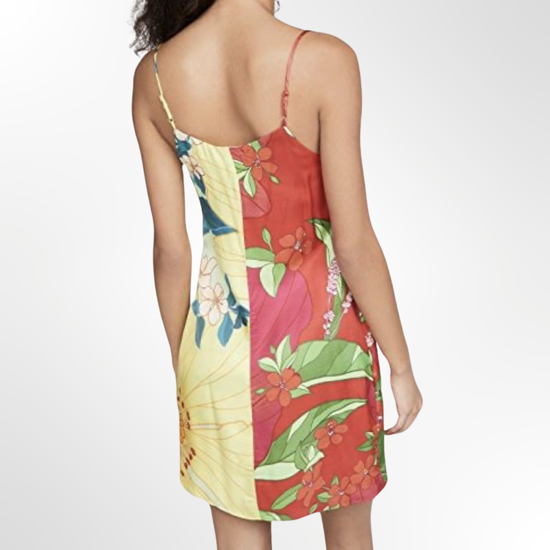 Vestido de tirantes ajustables con diseño en dos bloques de colores con estampado de prints tropicales . Cierre a presión en parte delantera cruzada. Lazo al costado.