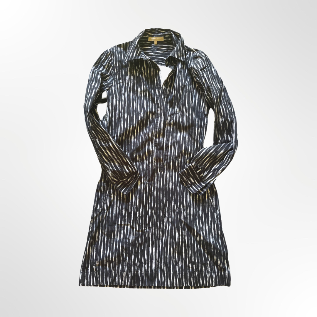 Vestido estampado cuello camisero, largo sobre la rodilla y manga larga, con bolsillos a los costados.