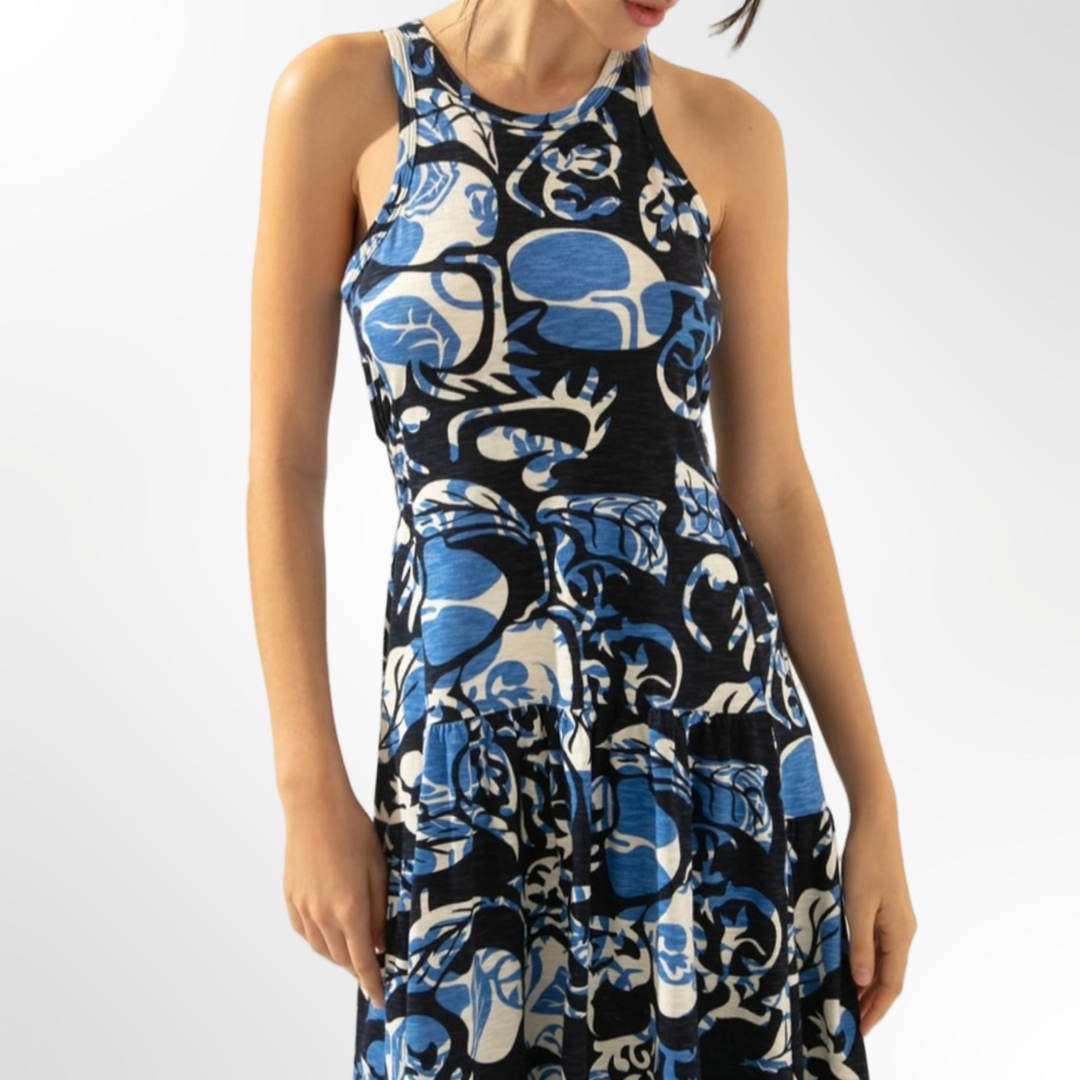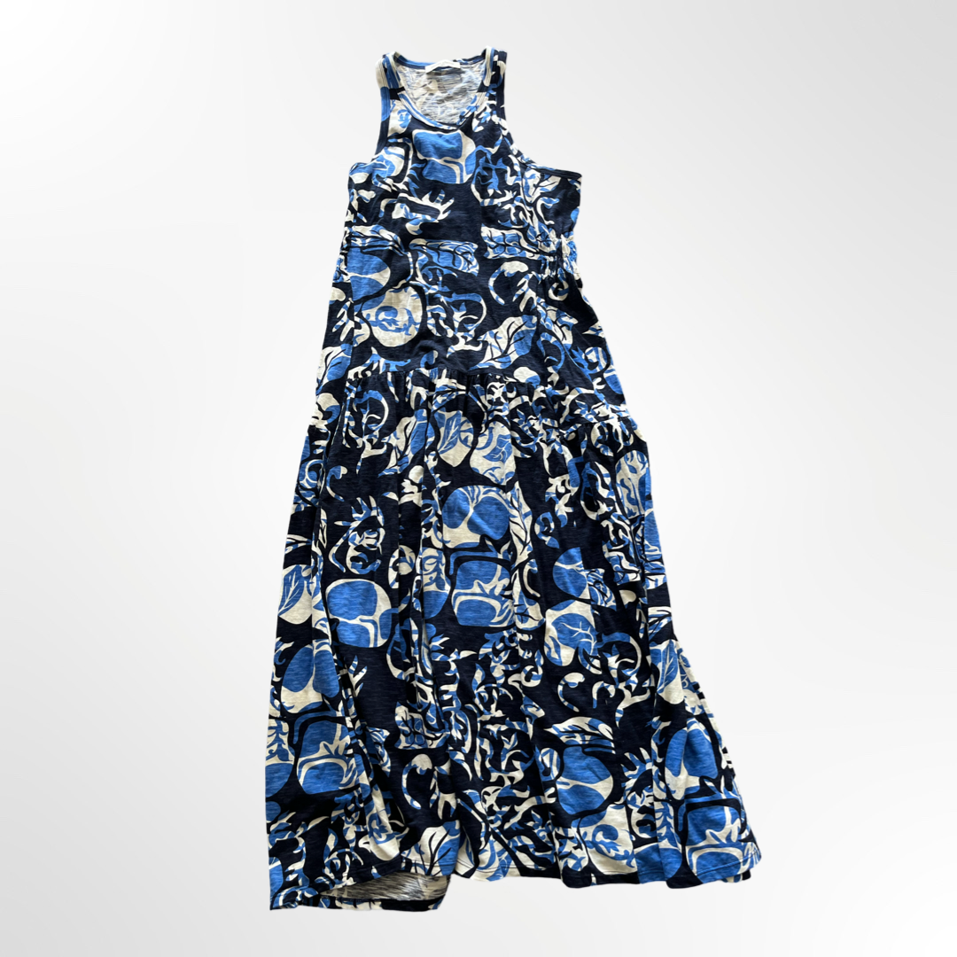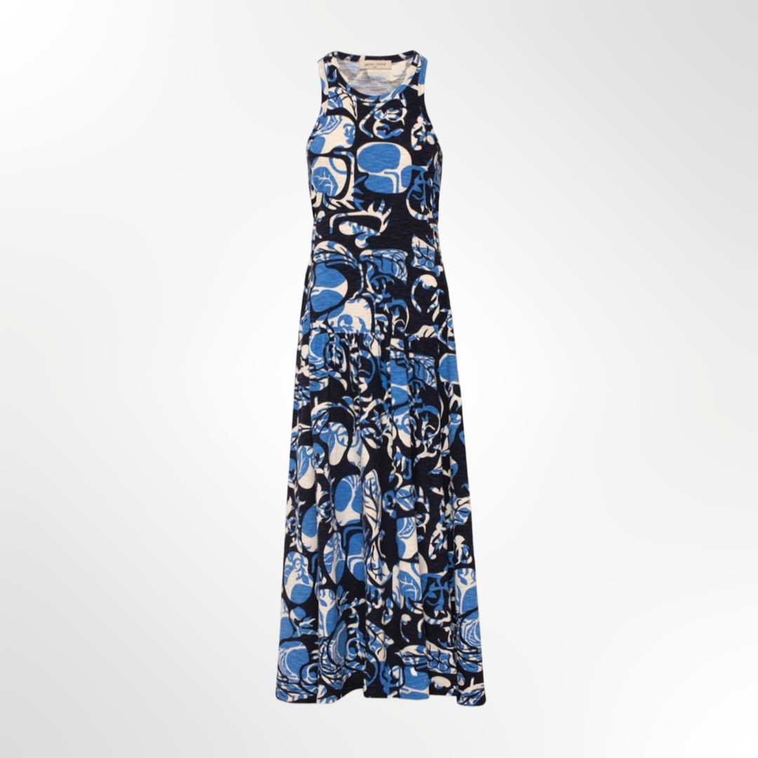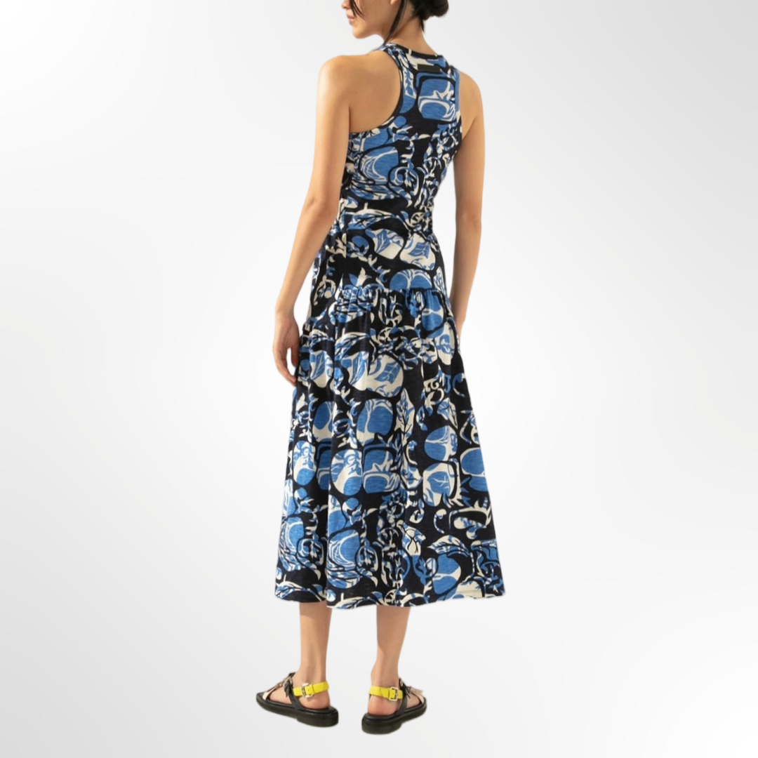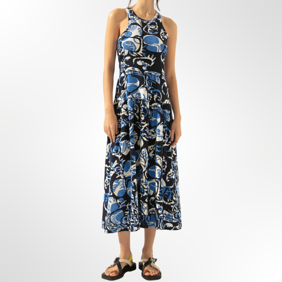 Vestido largo confeccionado en tejido de algodón estampado. Posee zona fruncida en la cintura y vuelo que aportan movimiento y textura a la prenda.