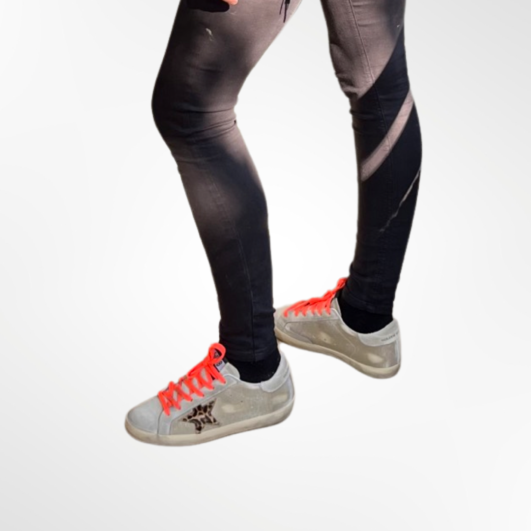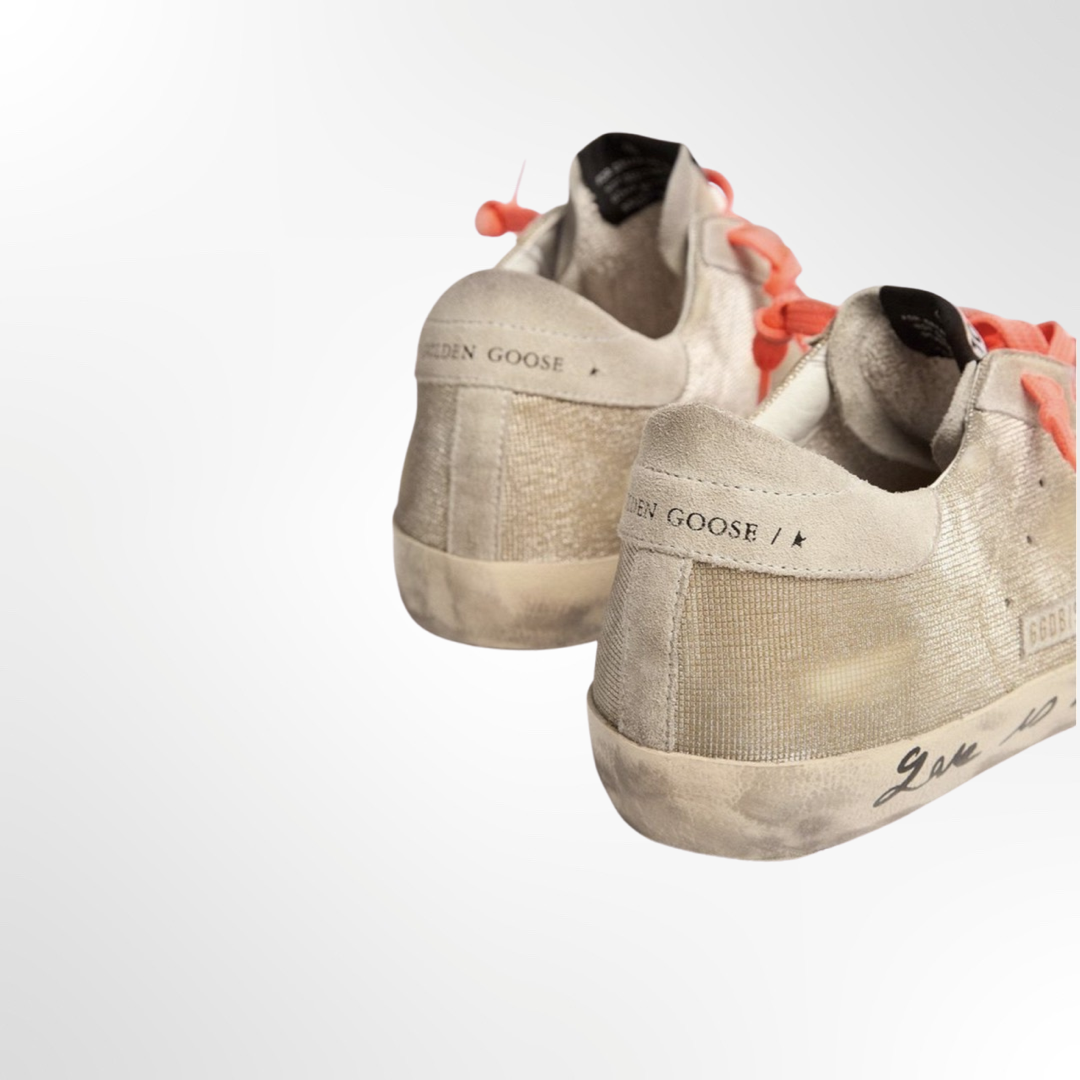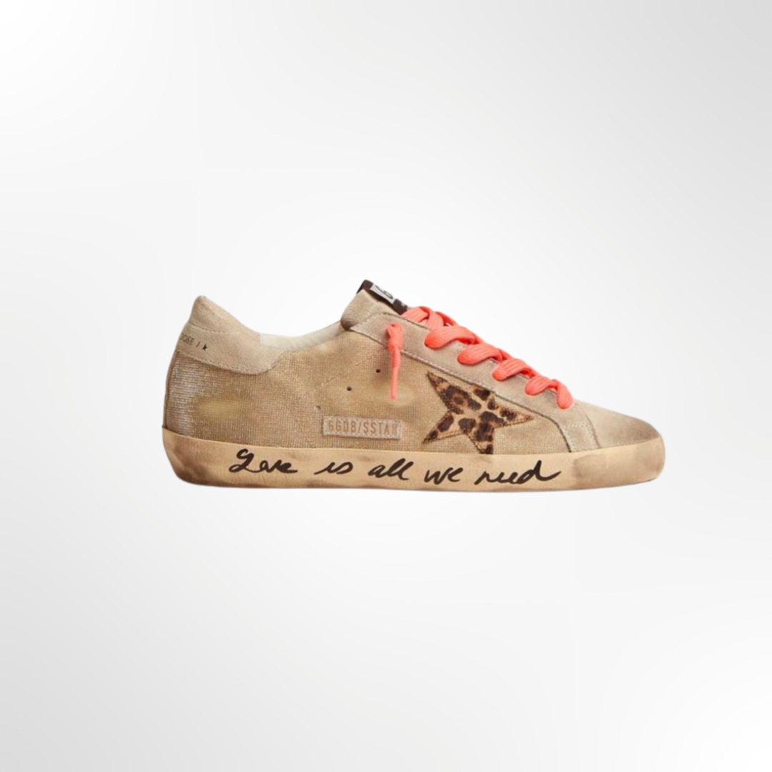 Zapatillas deportivas superstar de malla con cordones en naranja fosforescente. Estrella en animal print. Mensaje escrito a mano en la cinta foxing. Taco interno. Tratamiento vintage.
