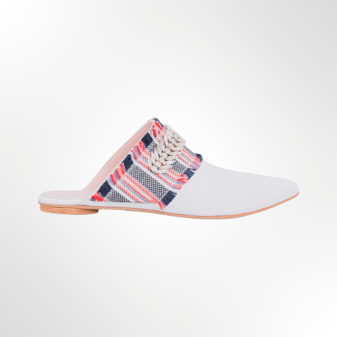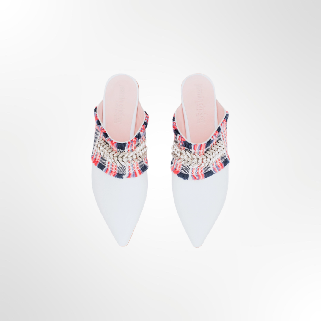 Zapato en punta abierto en el talón. Sobre la capellada lleva una cinta con flecos dobles y un aplique armado con piedras cristal.