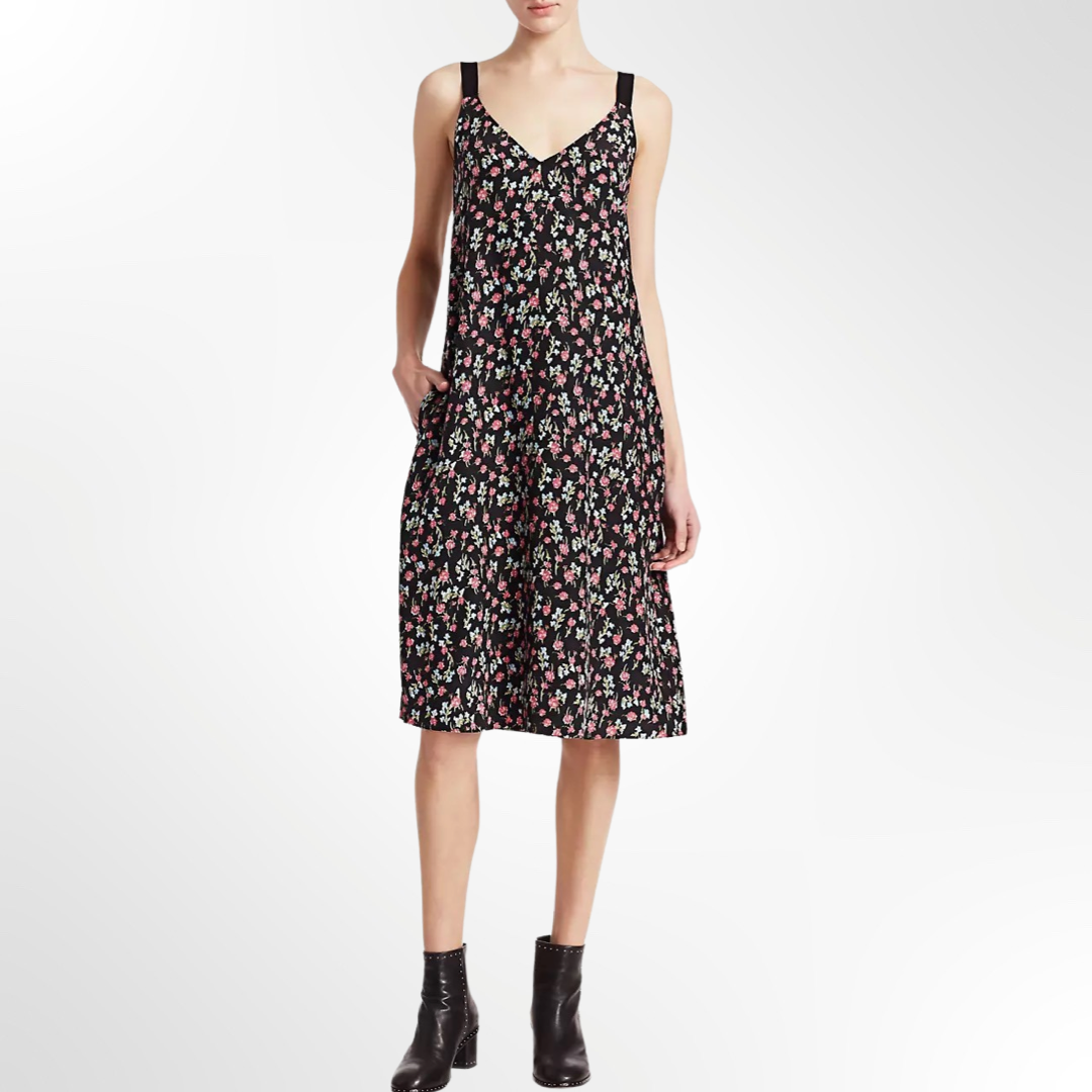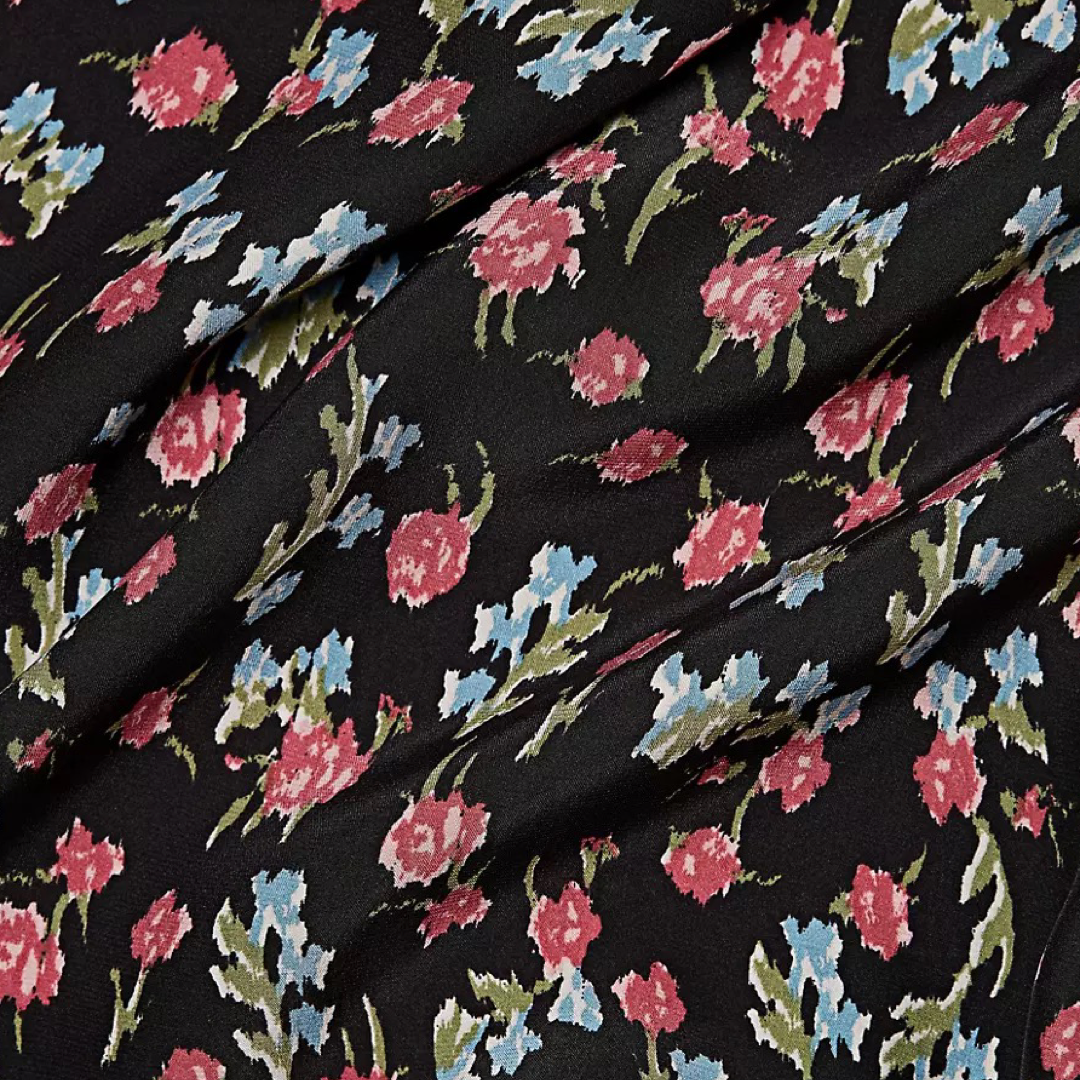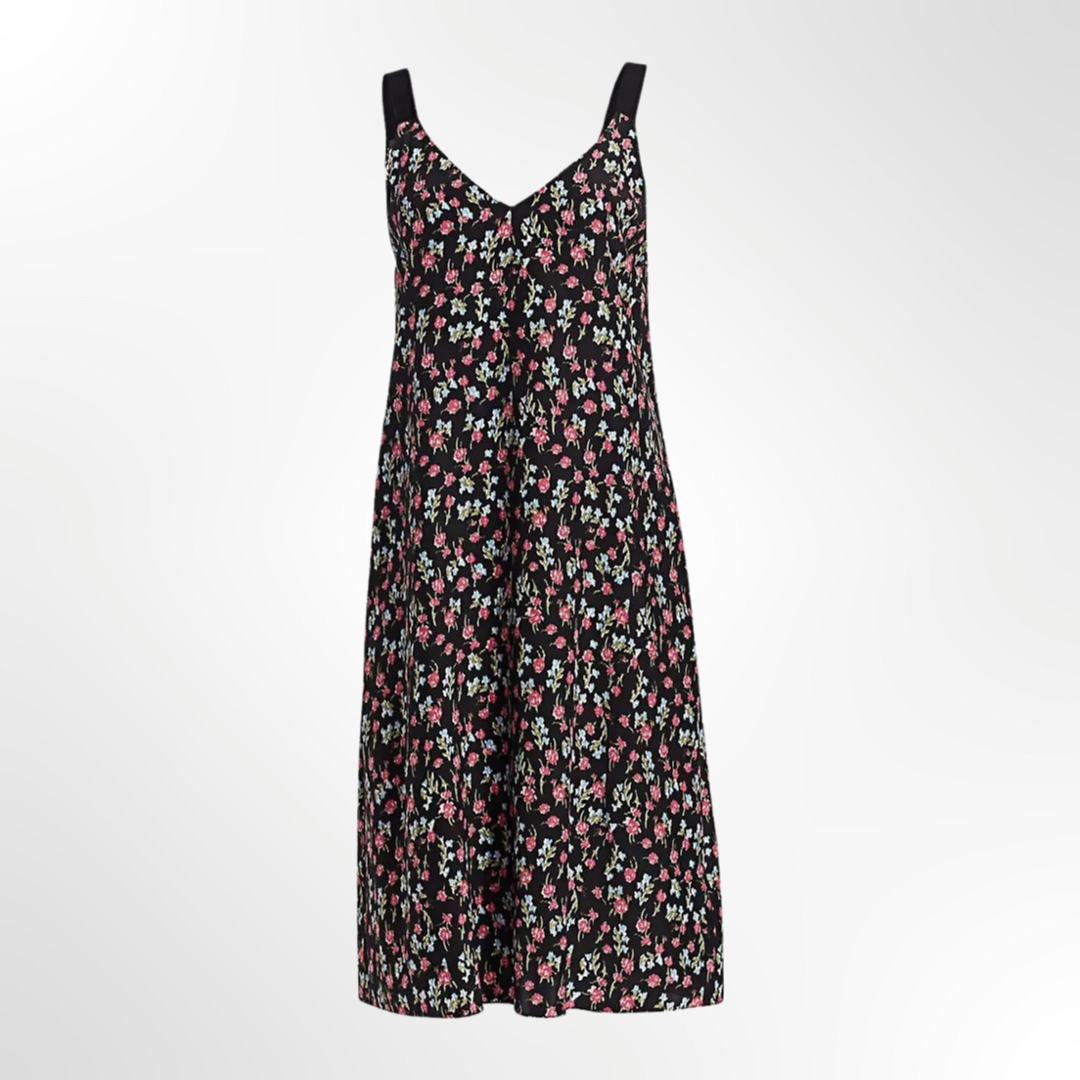 Vestido floreado cuello en V, largo bajo la rodilla en charmeuse de seda.